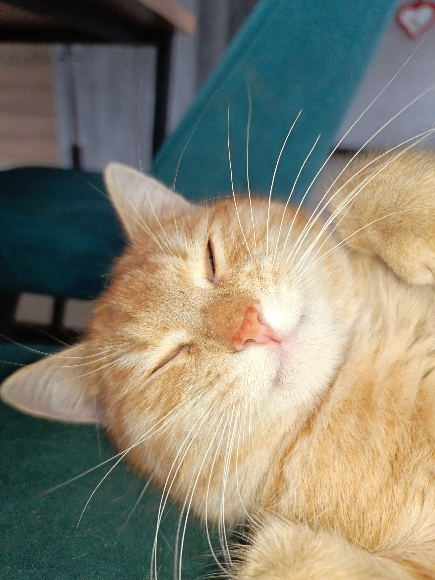 A close-up photograph depicts a ginger cat sleeping on a green chair. The cat's eyes are partially closed, and its whiskers are prominent. The background includes a teal-colored object and the edge of…read more