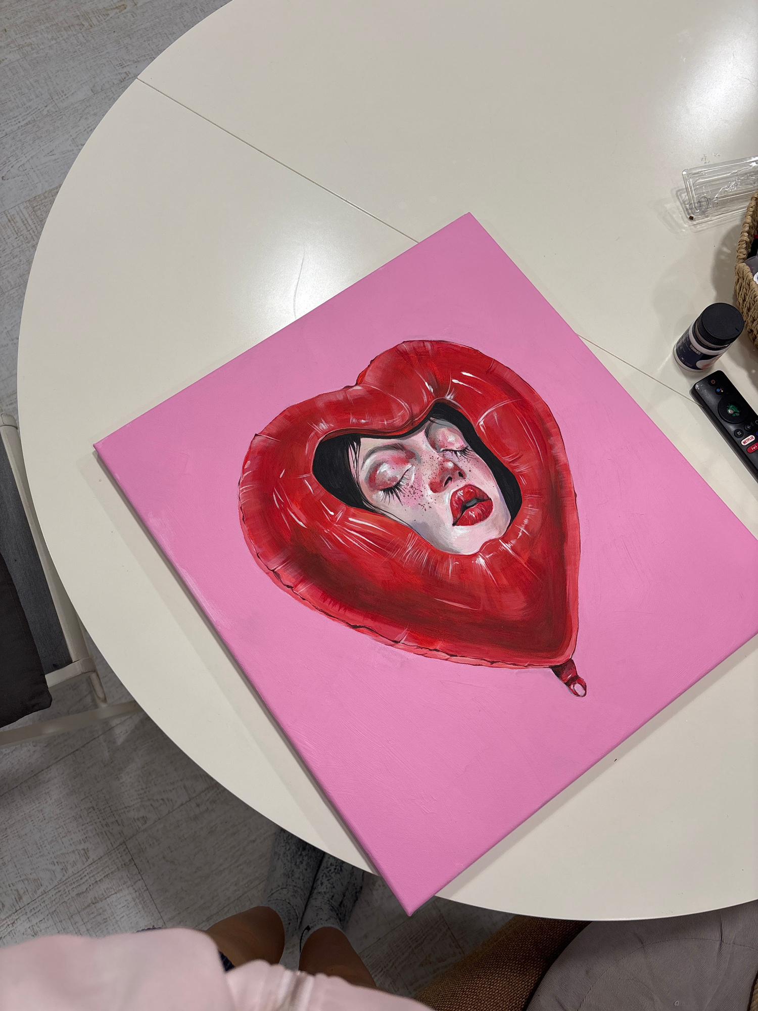 The image shows an oil painting on a pink canvas. The painting depicts a face encased within a red, heart-shaped balloon. The subject's skin tone is a pale white with freckles, and their lips are pain…read more