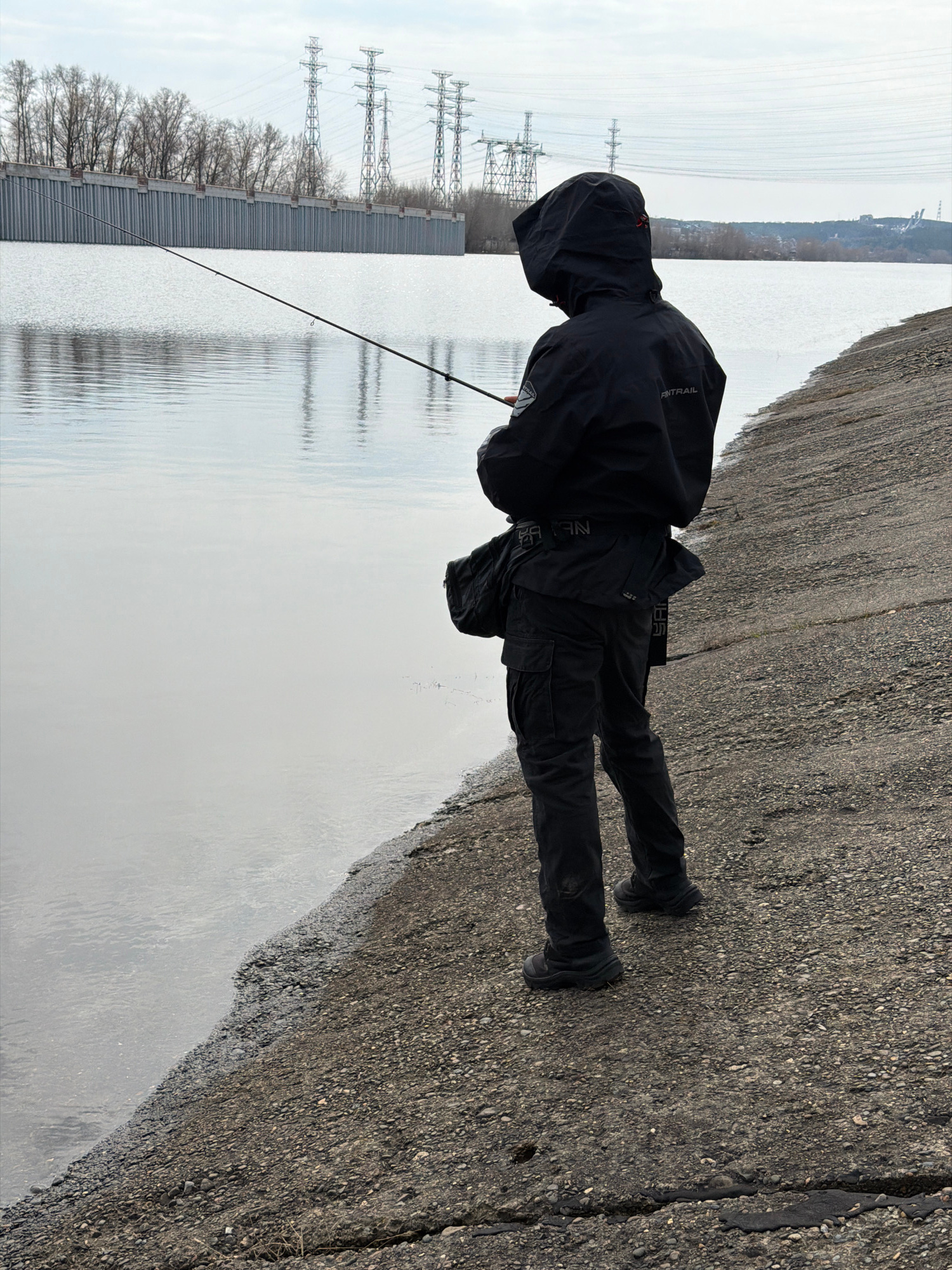 A person wearing a black jacket, pants, and shoes stands on a paved surface next to a body of water, holding a fishing rod. The water reflects the sky and nearby objects. Power lines and trees are vis…read more