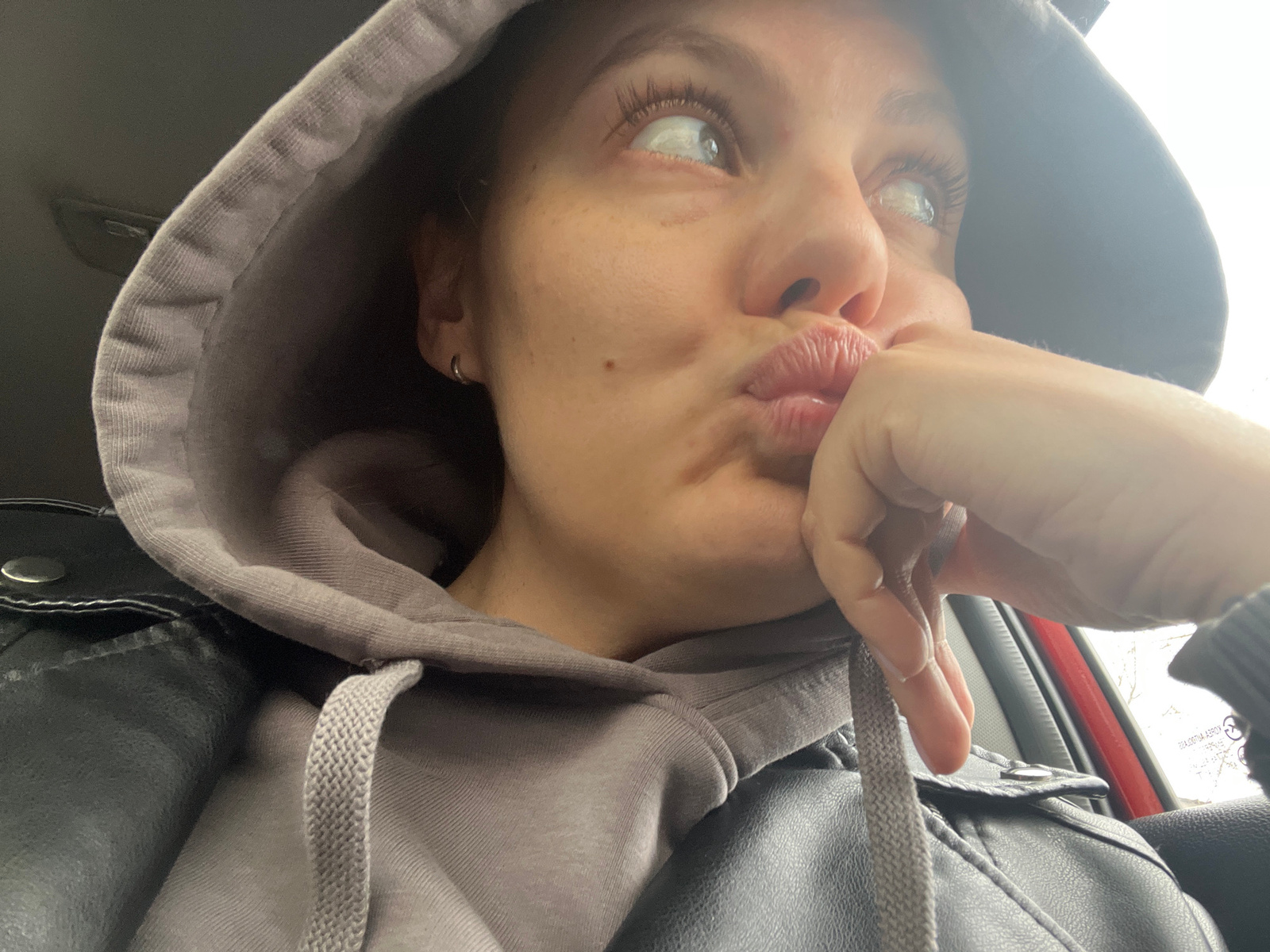 The media file, captured in Chaikovsky, Russia, features a close-up selfie of a person, rotated 90 degrees counter-clockwise from a standard upright orientation. The individual, seen from the chest up…read more