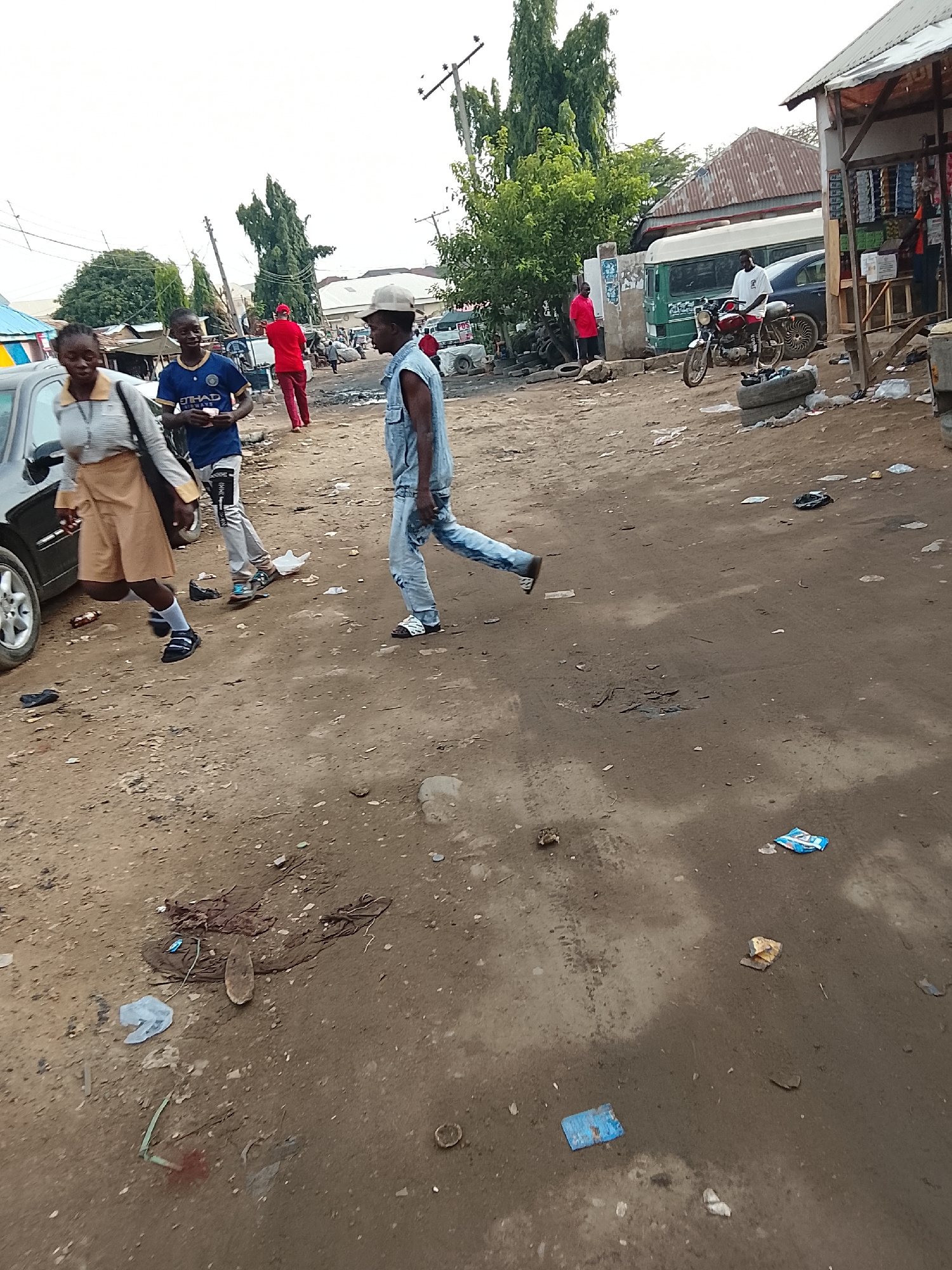 The image shows a dirt road in what appears to be a commercial area. Several people are present: a young woman in a light-colored top and khaki skirt walks near the left edge of the frame; a young man…read more