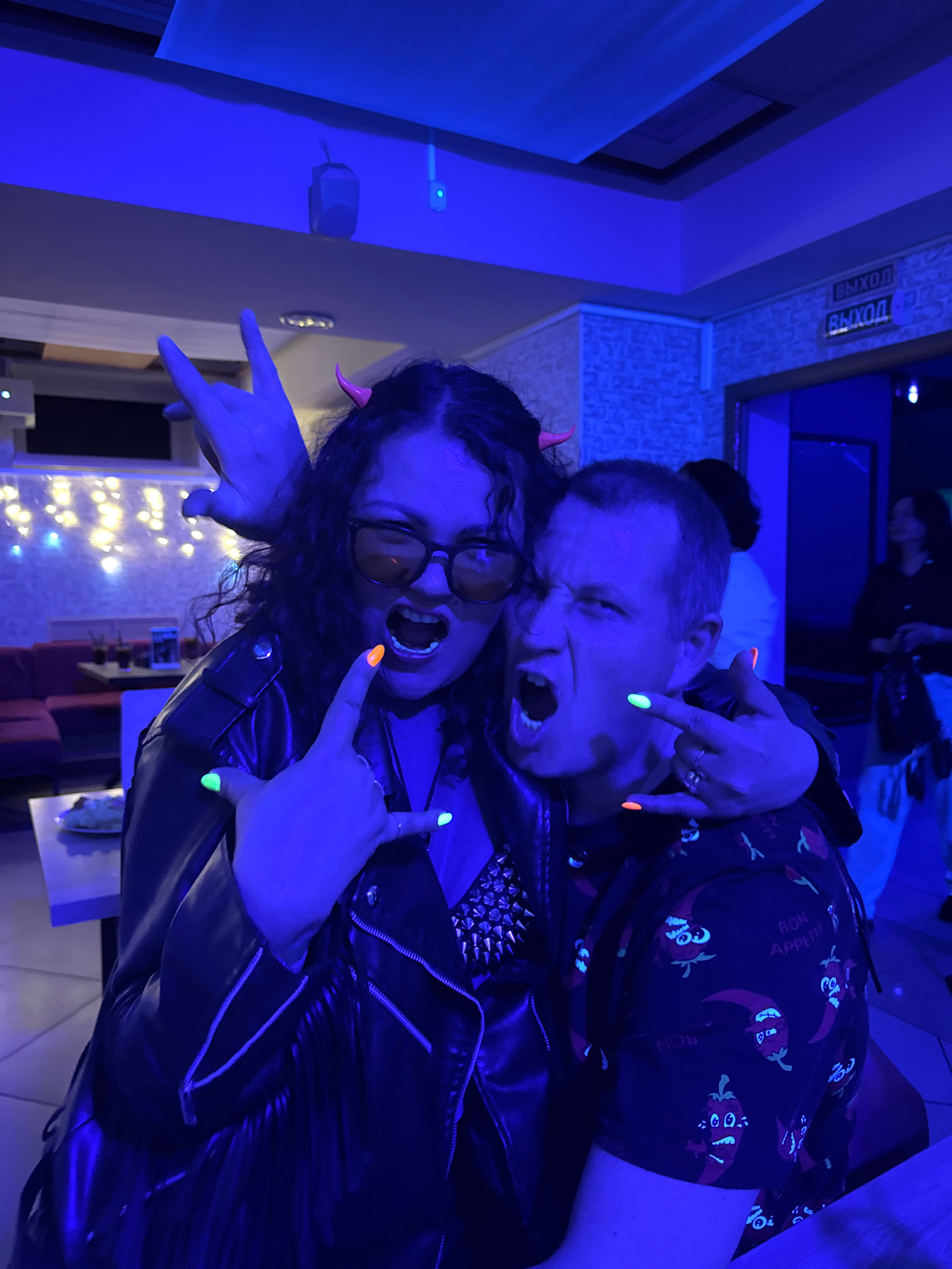 Two individuals are posing for a photograph under a blue light, possibly in a nightclub or entertainment venue. The man on the right has short hair and is wearing a black shirt with red chili pepper d…read more