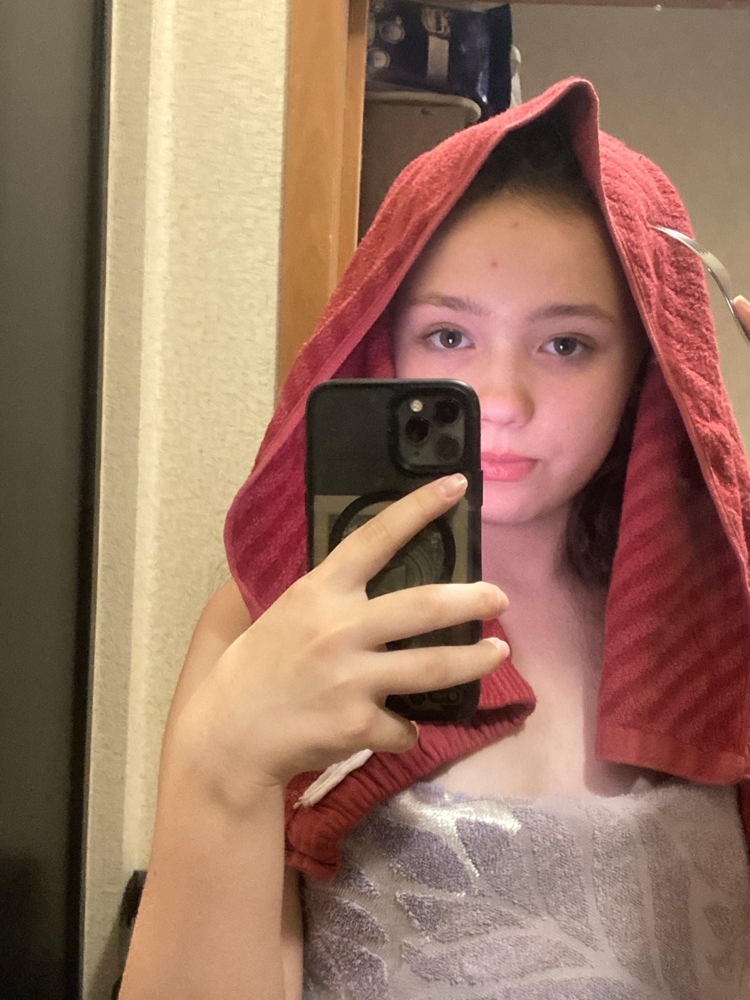 A girl is taking a selfie in a mirror, possibly in a bathroom setting. She is holding a black smartphone in her right hand, which is partially obscuring her face. She is wearing a red towel draped ove…read more