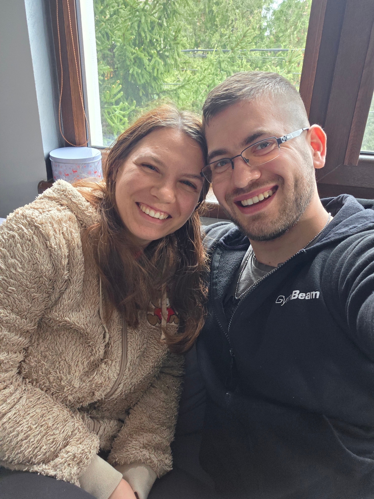 Two people are posing for a photo indoors. A man with short grey hair, glasses, a beard, and wearing a black hoodie with the word "GymBeam" on the sleeve is positioned above a woman. The woman has lonβ¦read more