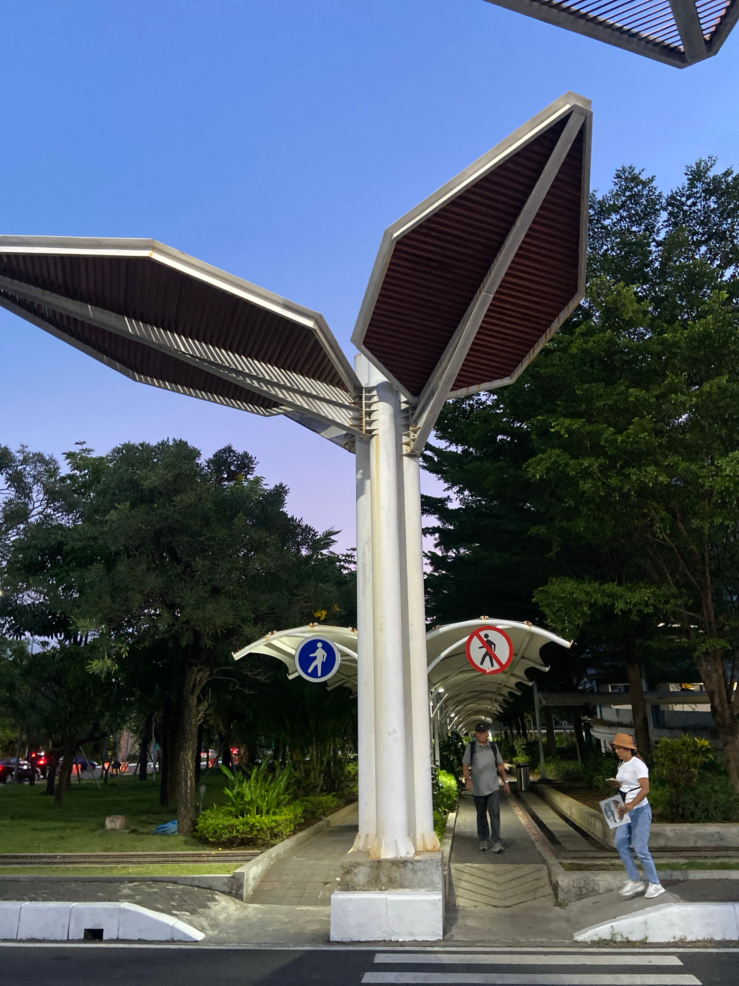 The image depicts an elevated pedestrian walkway in Kuta, Indonesia. The walkway is supported by a central white pillar with a decorative structure resembling stylized leaves, extending upwards and do…read more