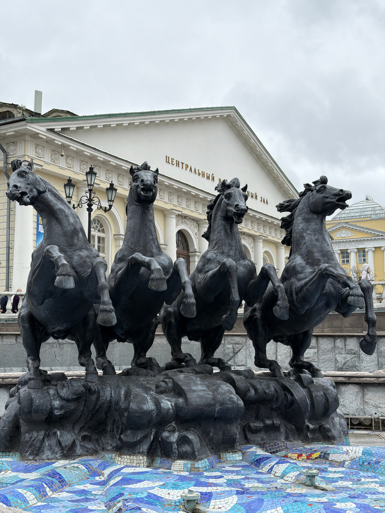 The image captures the "Four Horses" sculptural fountain at Manezhnaya Square in Moscow, Russia. Four bronze horses are depicted rearing up in a dynamic display, with a rocky base that serves as the f…read more