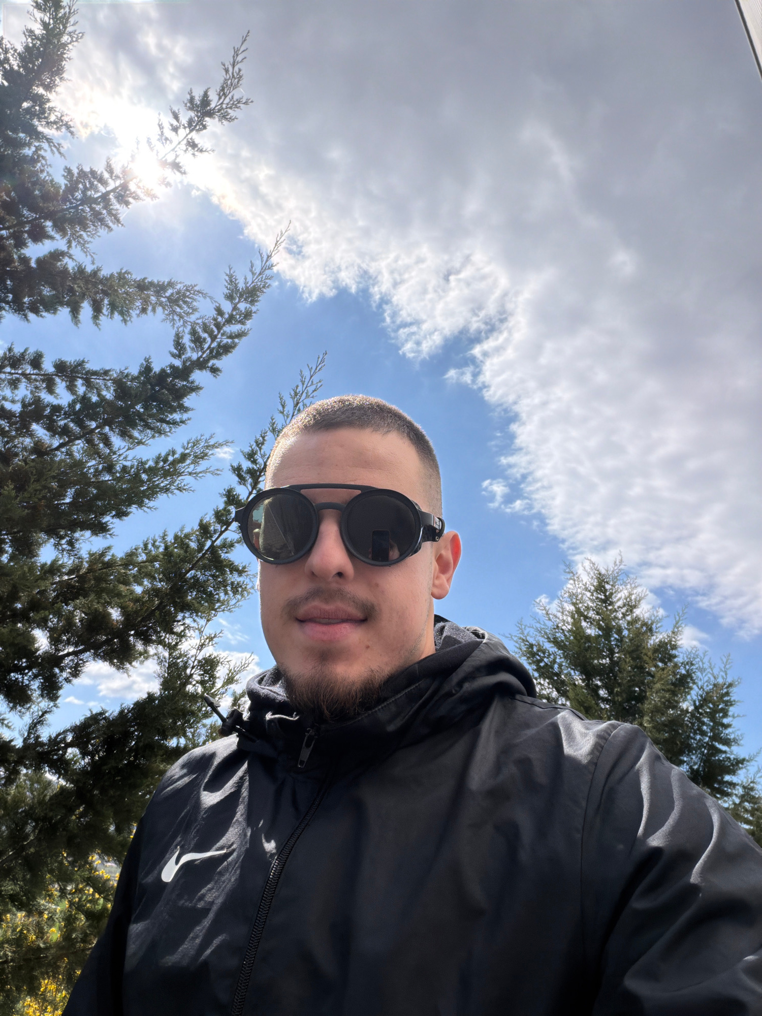 A medium-shot, angled upward, depicting a man wearing black sunglasses and a black hooded jacket, possibly a Nike jacket. He has short-cropped hair and a beard. Behind him is a sky with white clouds a…read more