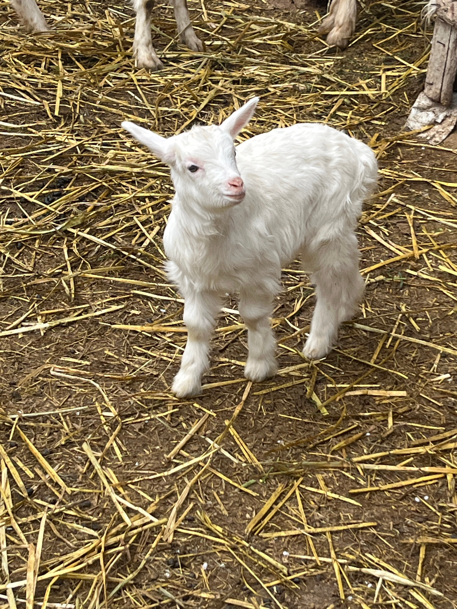 A white baby goat lies on a bed of hay, indoors. It is oriented towards the upper left of the frame. Its head is angled upward, and it appears to be looking at the camera. The floor beneath the hay ap…read more