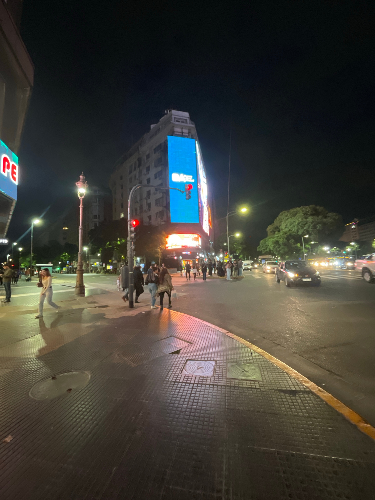 This is a nighttime photograph taken at an intersection in Buenos Aires, Argentina. The image is tilted to the right. In the lower left corner, the illuminated red lettering of the word "PEPSI" is par…read more