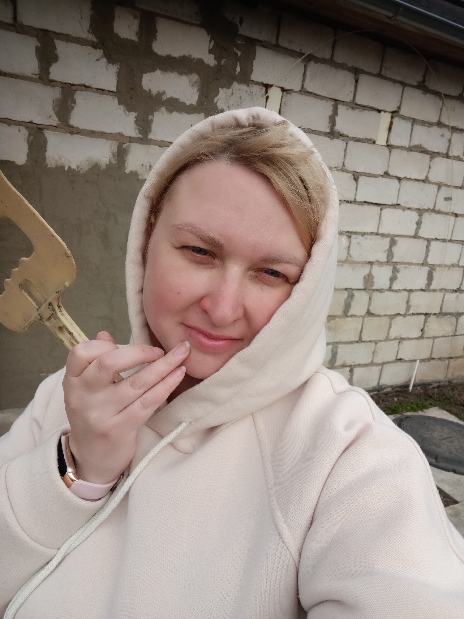 A blonde woman, likely in her mid-20s to 30s, is featured in a close-up outdoor selfie, looking directly at the camera with a subtle, soft smile. She is wearing a light beige or pale pink hooded sweat…read more