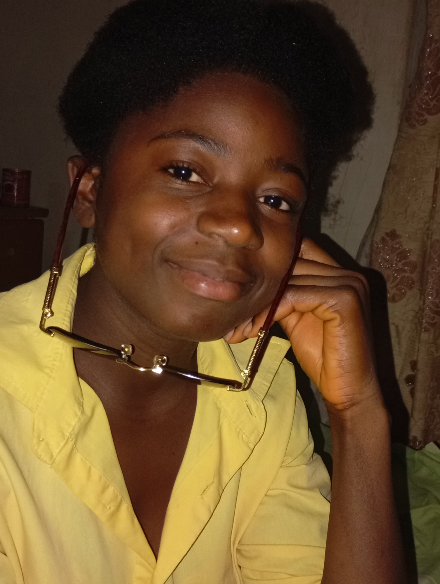 A close-up shot depicts a Black person wearing a yellow collared shirt. They have dark hair, dark eyes, and are smiling slightly. The person is holding a pair of glasses with a brown frame in one hand…read more