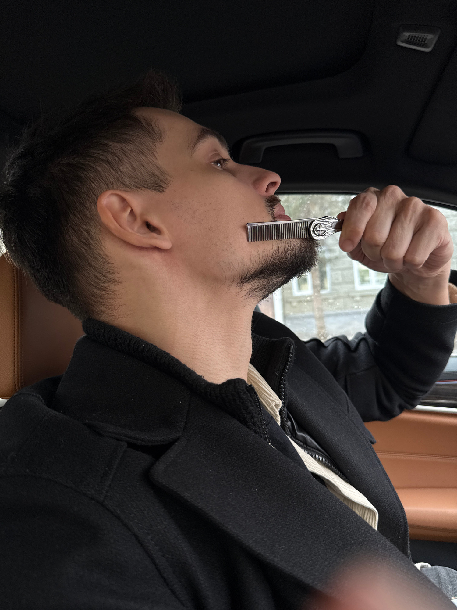 The image, taken sideways, depicts a person, likely male, with short dark hair and a beard or stubble, inside what appears to be a vehicle, possibly a car, in Krasnoyarsk, Russia. The individual is ho…read more