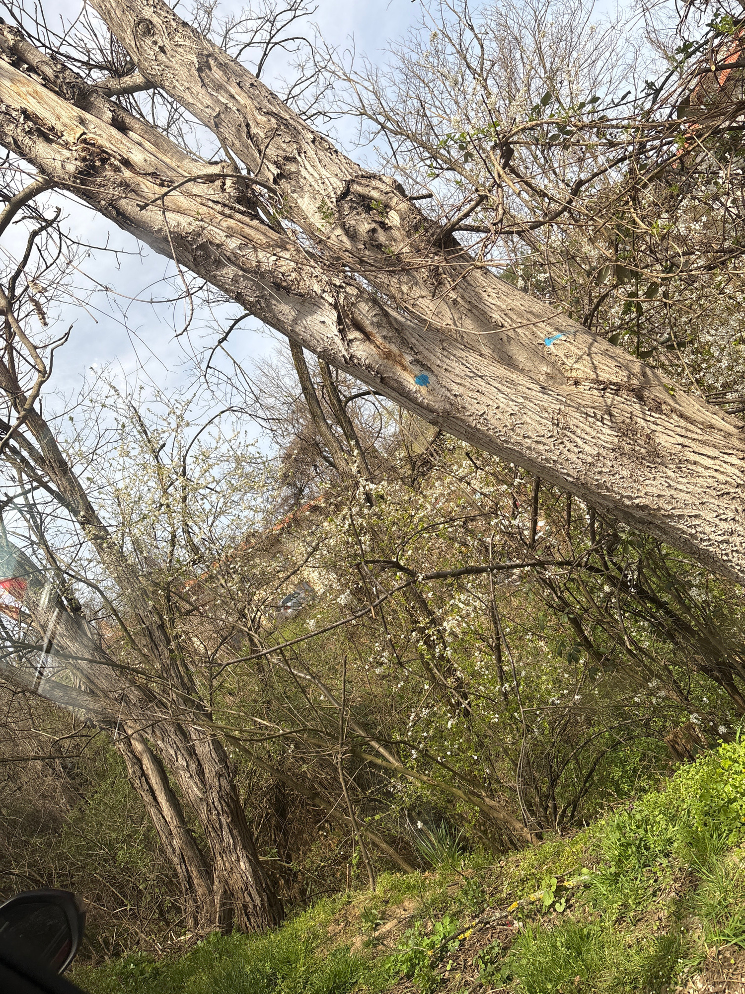 The image depicts a view upwards into a cluster of trees, possibly located in Teteven, Bulgaria. A thick-trunked tree with textured bark dominates the left side of the frame. Blue markings are visible…read more