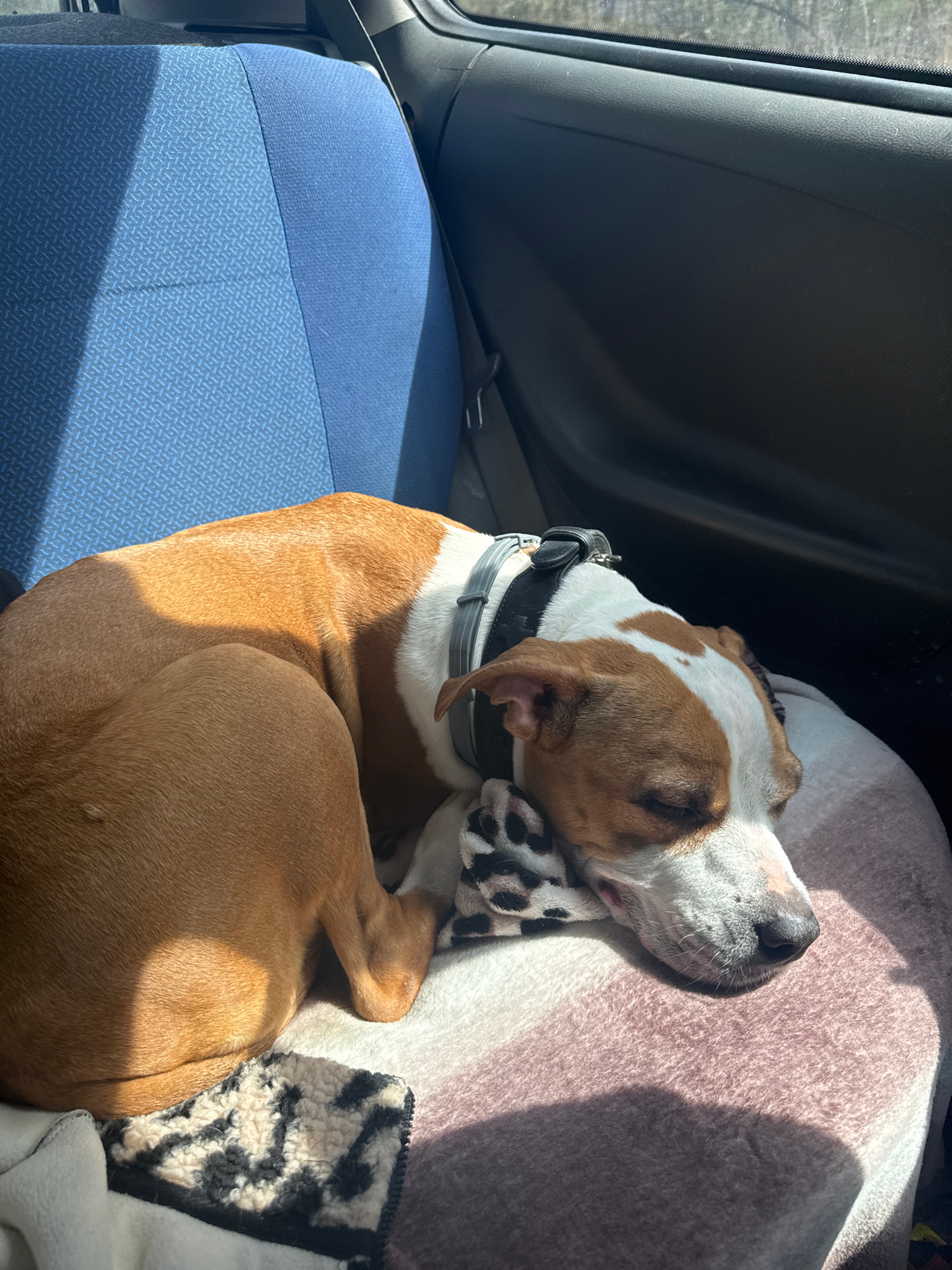 The image shows a medium-sized brown and white dog asleep in a car. The dog is curled up on a light-colored blanket with a black and white patterned edge. The dog is wearing a black collar. The car se…read more