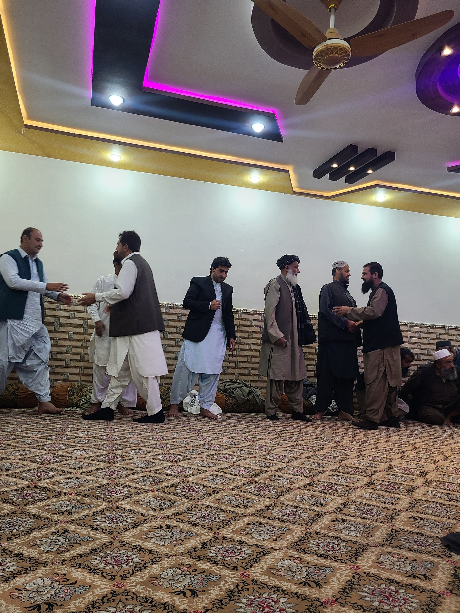 The image shows a group of men standing on a patterned carpet in a room. Most of the men are wearing traditional Pakistani clothing, including shalwar kameez and vests. The setting appears to be indoo…read more