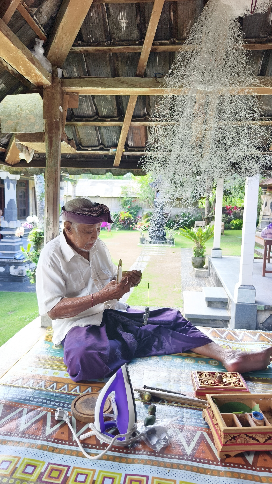 An elderly Balinese man is seated in a covered outdoor space, possibly a pavilion or veranda, in Pecatu, Indonesia. He wears a white short-sleeved shirt, purple pants, and a traditional Balinese headd…read more