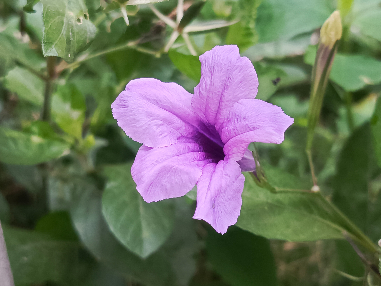 A close-up shot captures a purple flower in full bloom, surrounded by a lush green background of leaves. The flower is the focal point, its petals textured and delicate in appearance. Adjacent to the…read more