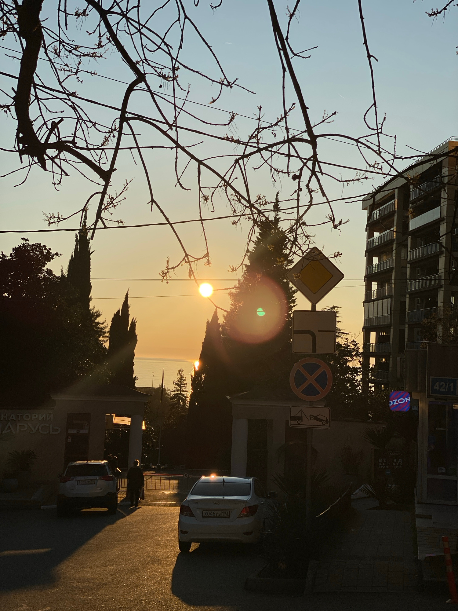 The image shows a street scene in Sochi, Russia, captured during sunset or sunrise. In the foreground, bare tree branches are silhouetted against the sky. A building stands at the right angle, with a…read more