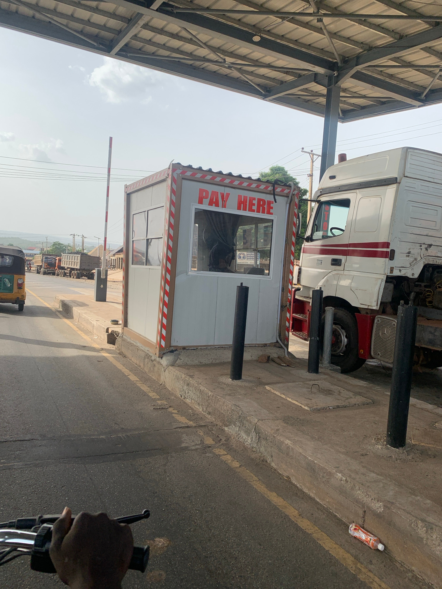 The image depicts a toll booth, labeled "PAY HERE" in red letters, situated on a road in Lokoja, Nigeria. A white and red truck is positioned beside the booth, partially obscuring the view of the stru…read more