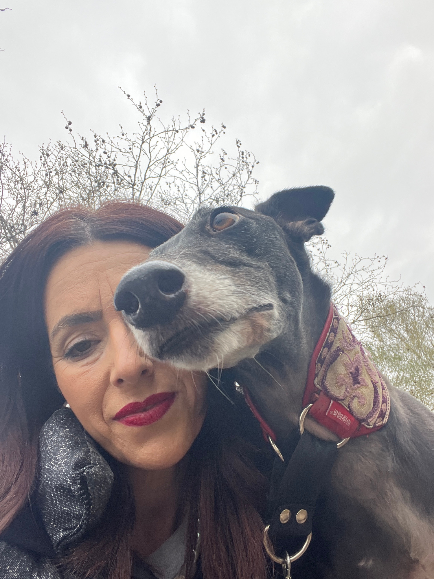 A selfie captures a woman with dark hair and red lipstick, nestled closely to a grey dog wearing a red harness. The photo is taken from a low angle, looking up towards the sky where bare tree branches…read more