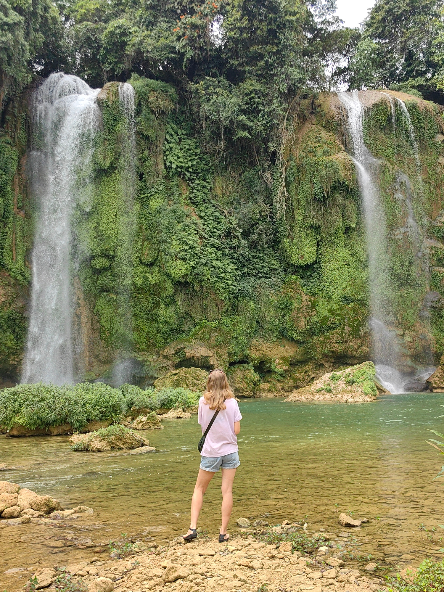 A woman stands in shallow, clear water, viewed from behind, facing a wide waterfall in Daxin County, China. The waterfall is composed of two main streams, one on the left being significantly wider tha…read more