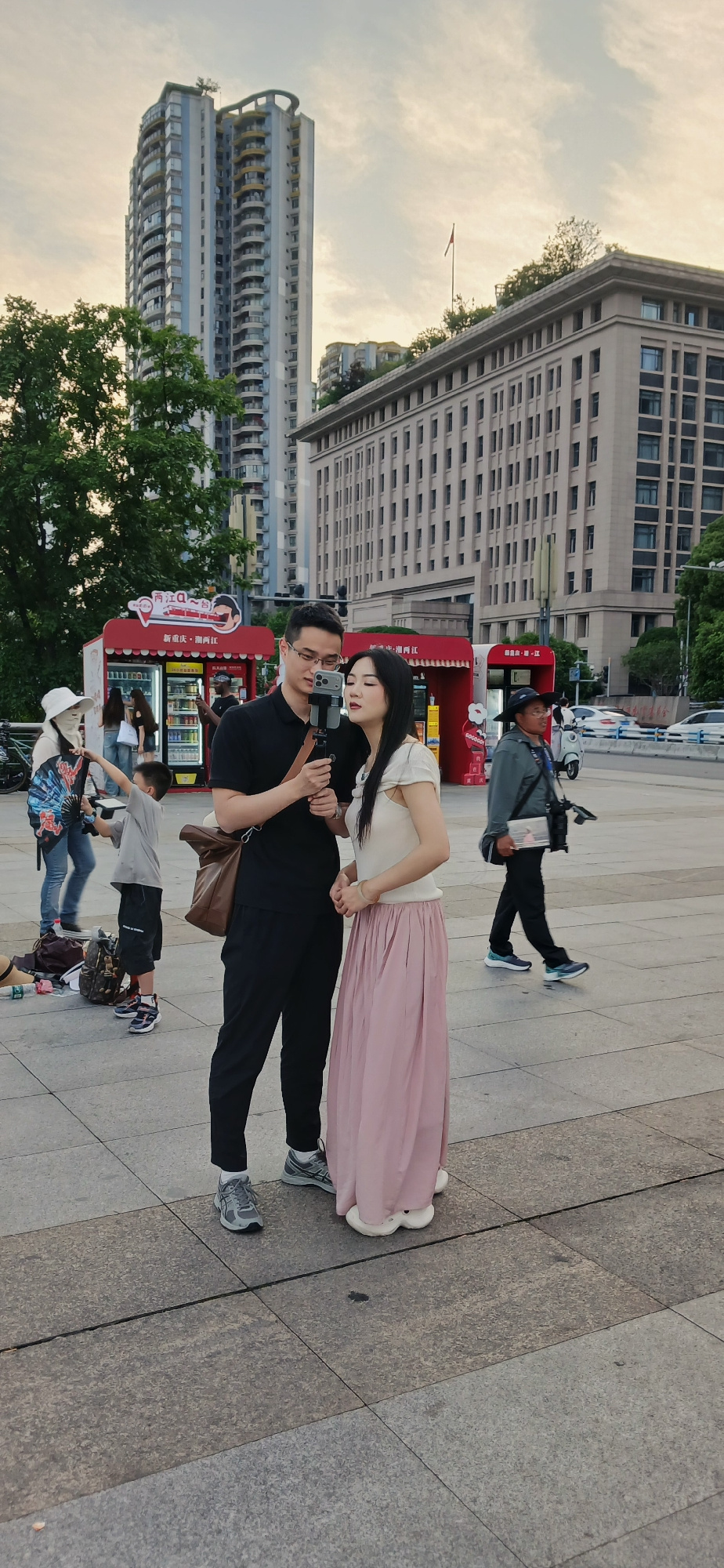 The image depicts a street scene in 江北城街道, China. A man and a woman stand together, the man holding a camera on a tripod, seemingly recording. The woman is dressed in a light-colored top and a long pi…read more