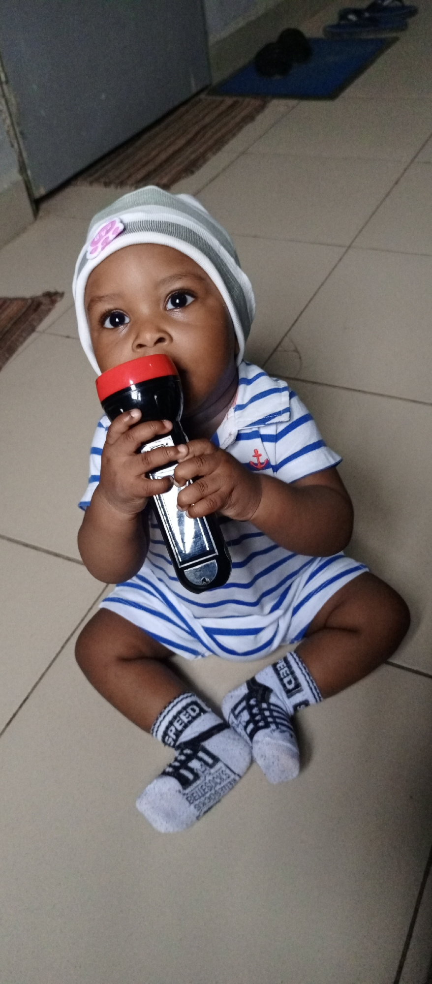 A baby sits on a tile floor in an indoor space. The baby wears a striped hat with a flower applique, a blue and white striped sailor suit, and socks with the word "SPEED" printed on them. The baby is…read more