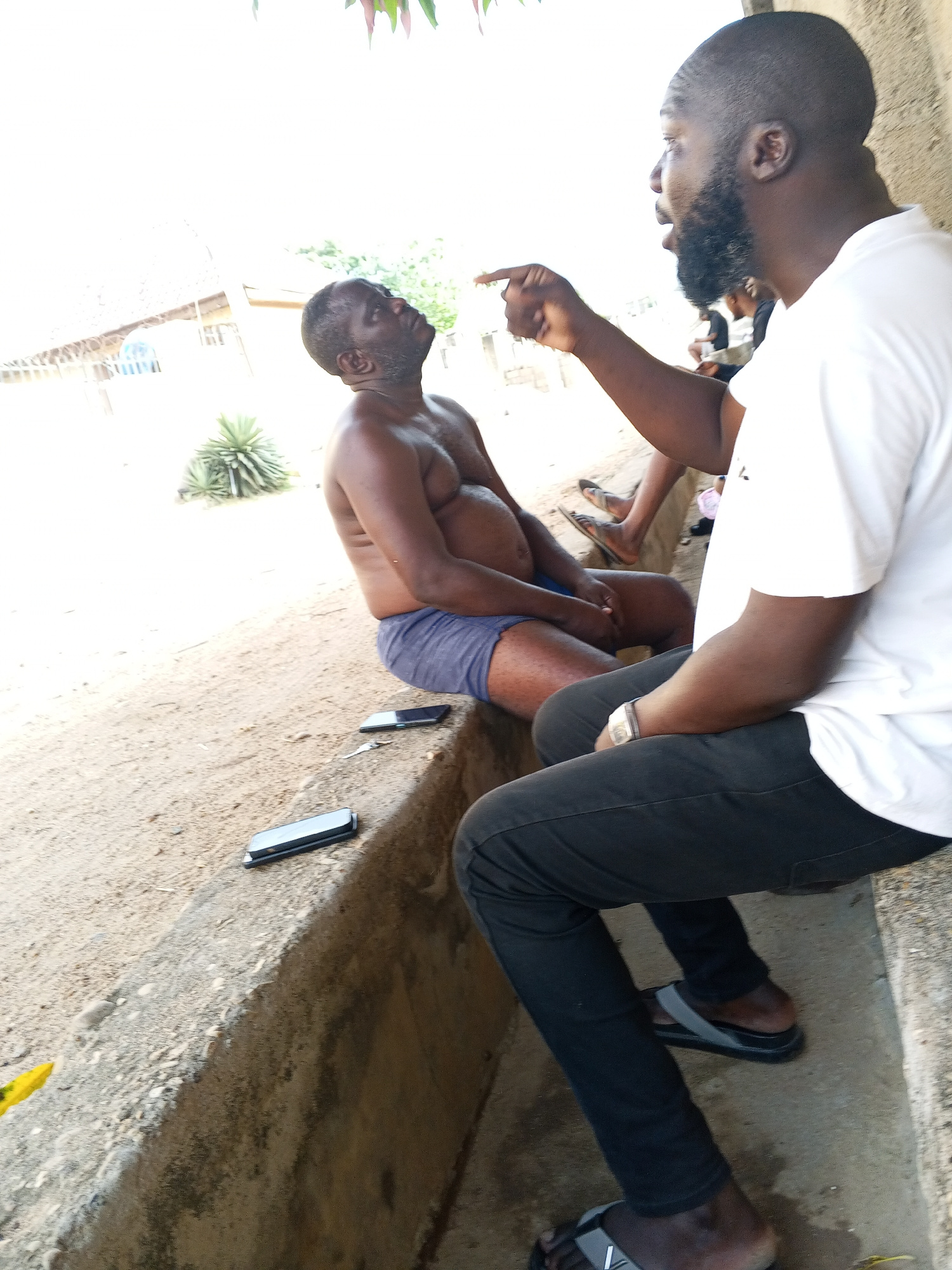 Two men are central to an outdoor scene, appearing to be engaged in a lively conversation. On the right, a man with a beard and a white t-shirt sits with black pants and sandals, actively gesturing wi…read more