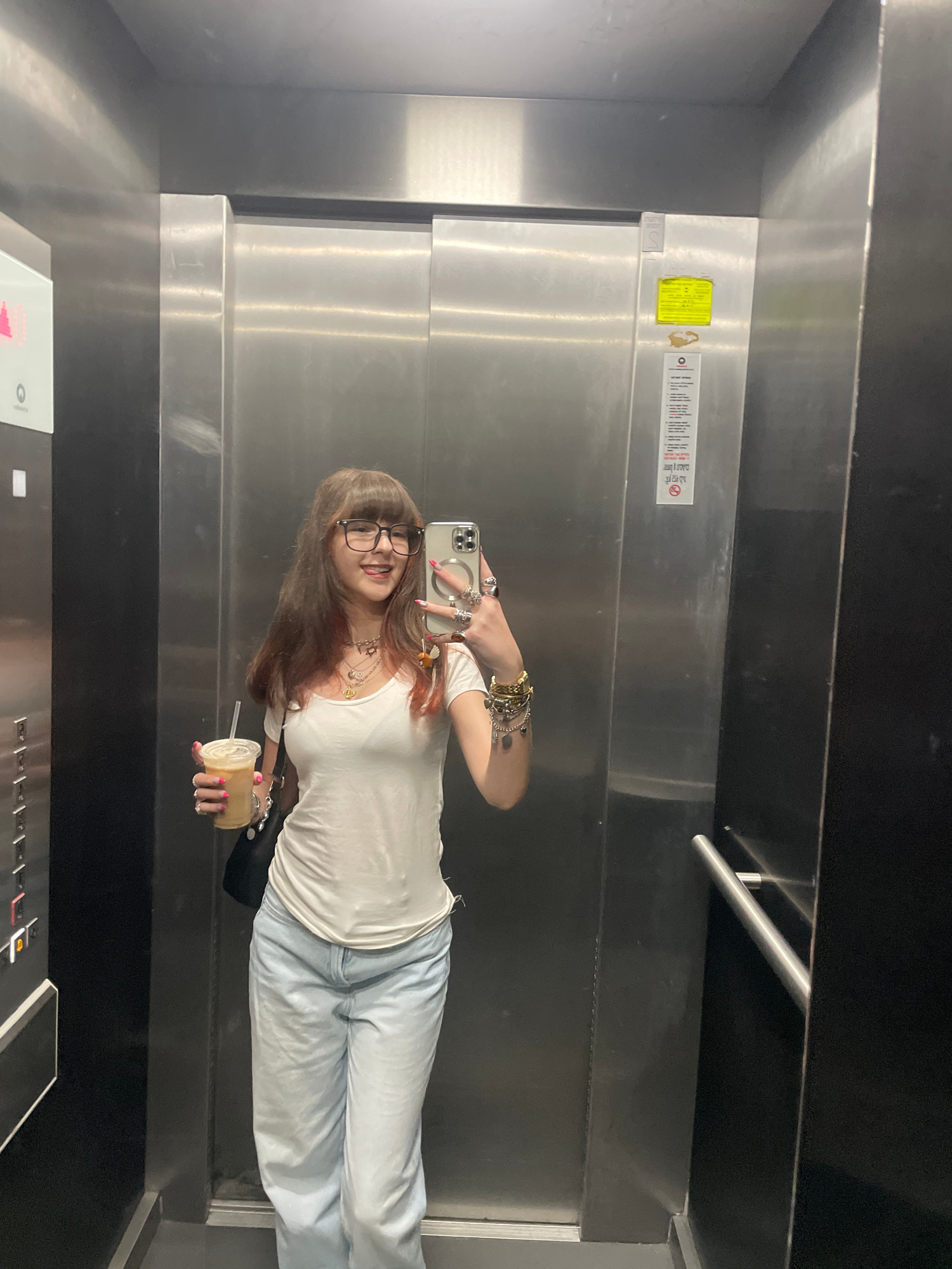 A young woman is taking a selfie in an elevator. She is wearing glasses, a white t-shirt, and light blue jeans. She is holding a drink in her left hand and a phone in her right hand. The elevator has…read more