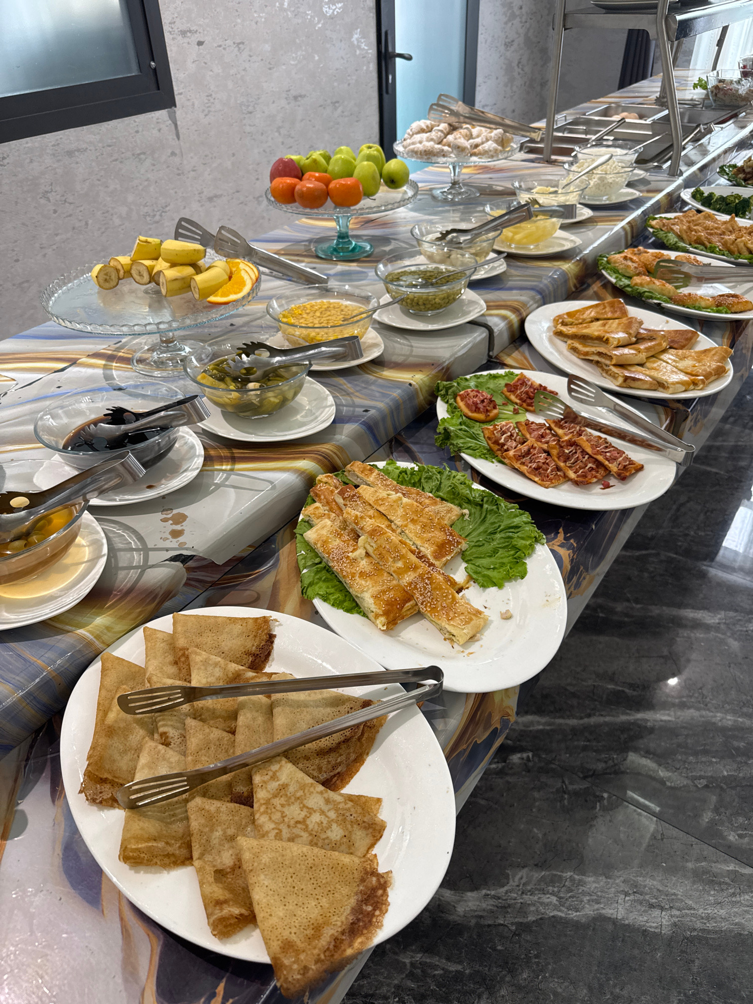 The image shows a buffet table in what appears to be an indoor dining area. The buffet includes a variety of food items, such as pastries, pancakes, and fruits, served on white plates and clear glass…read more