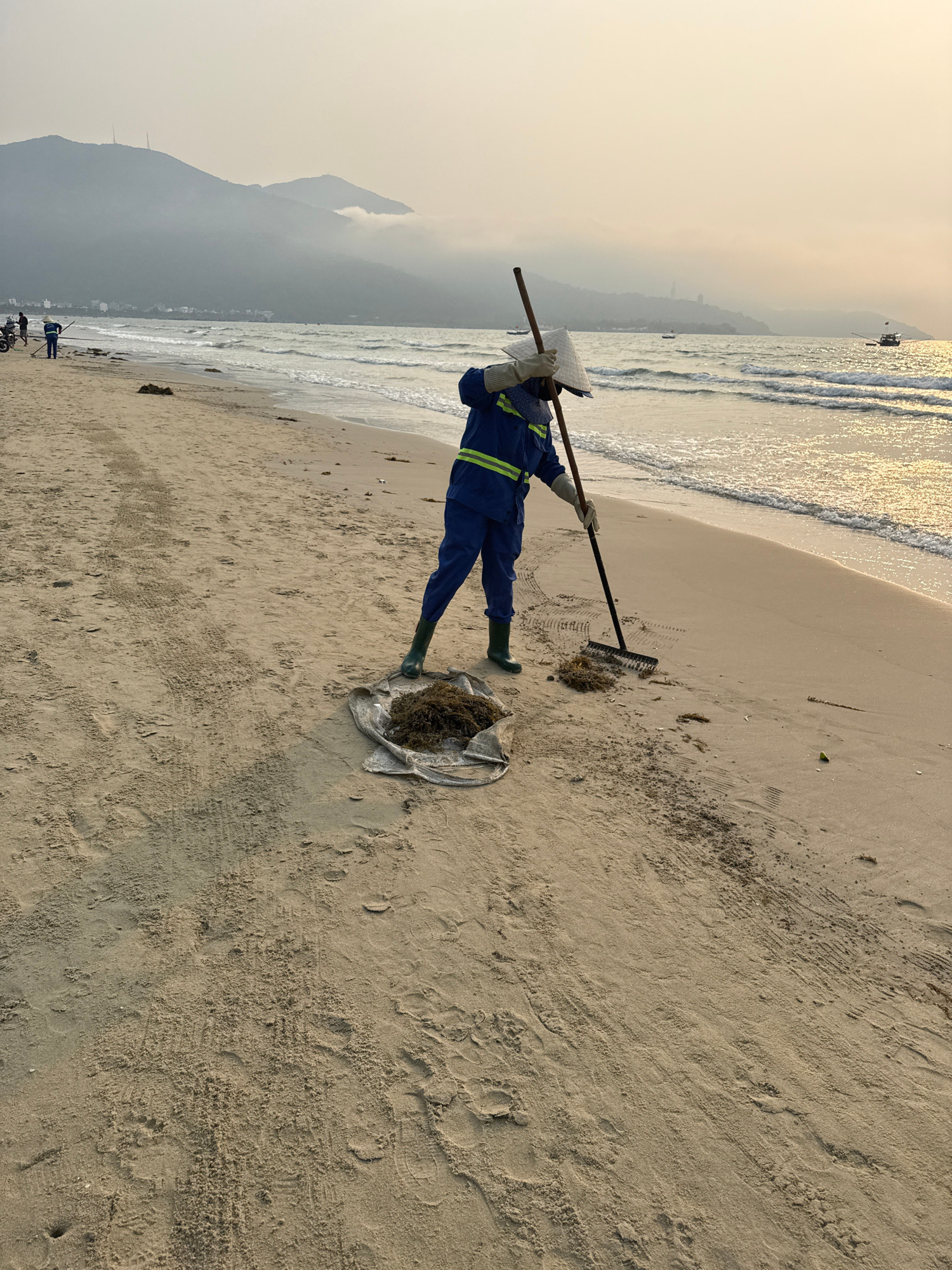 A person wearing blue work clothes, green boots, and a conical hat is cleaning seaweed from a sandy beach. They are using a rake to gather the seaweed and placing it into a white bag. In the backgroun…read more