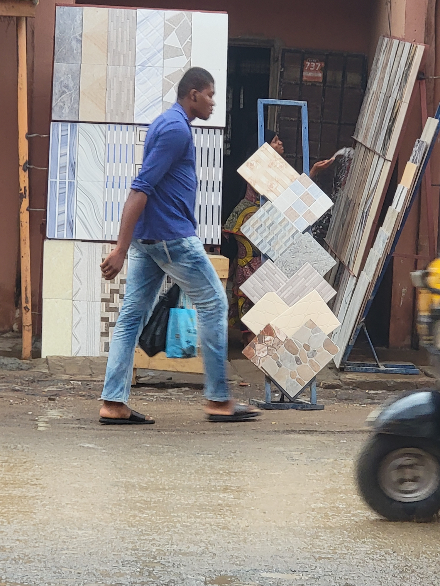 A man in blue shirt and jeans walks past tile samples displayed for sale in Maiburiji, Nigeria. The tiles are arranged in rows and columns, with various patterns and colors. A vehicle tire is visibleβ¦read more