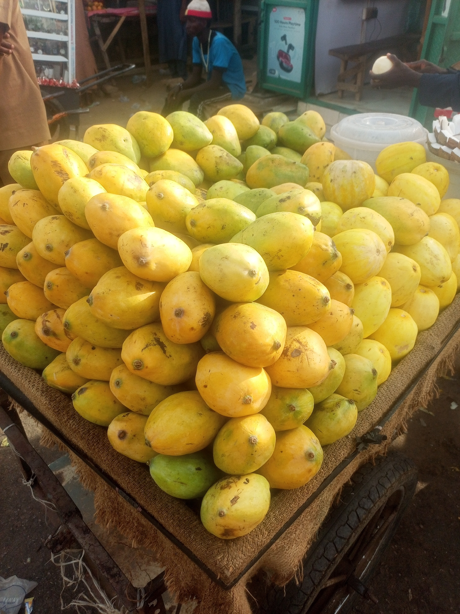 A large pile of yellow and green mangoes sits on a burlap-covered cart with a tire visible in the foreground. In the background, a man wearing a blue shirt and red-and-white striped hat is seated. A gā¦read more