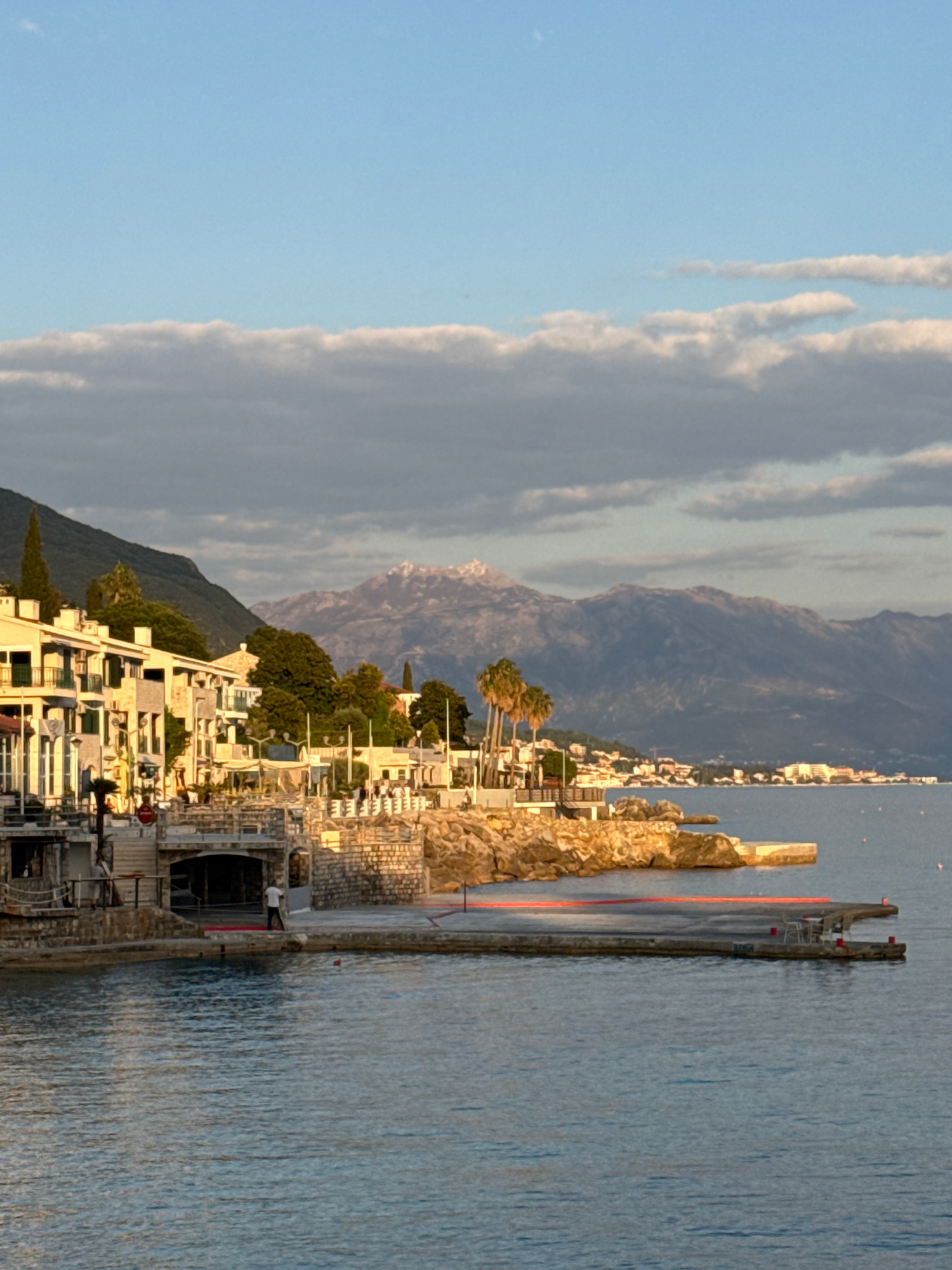 The image depicts a coastal scene in Herceg Novi, Montenegro, featuring a shoreline with modern buildings and vegetation, backed by mountains. A pier or constructed coastal area extends into the water…read more