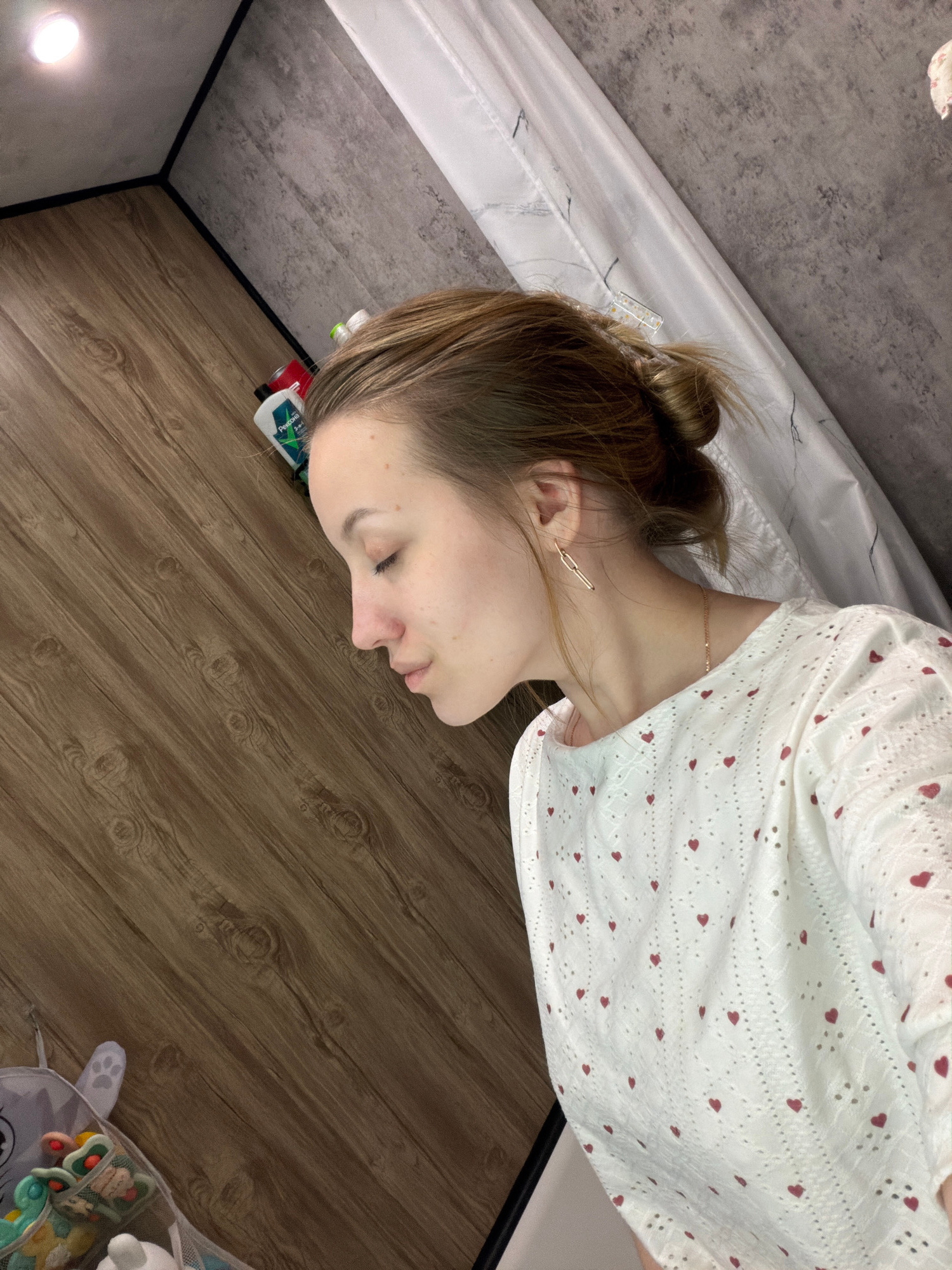 A woman with light skin and light brown hair in a bun is lying on a wood-patterned floor. She is wearing a white top with small red heart patterns and gold earrings and a necklace. Her eyes are closed…read more