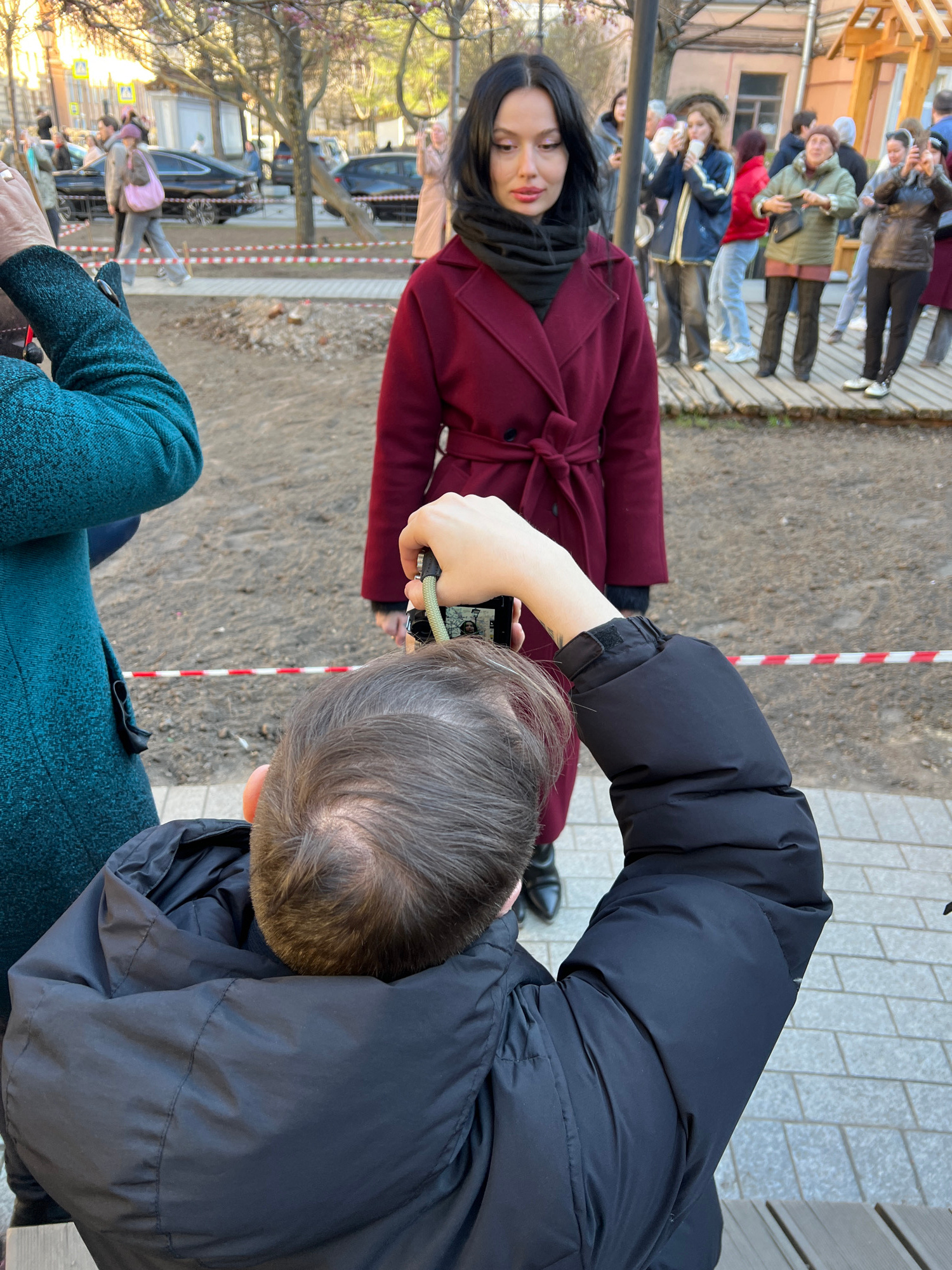 The image, rotated 90 degrees clockwise, depicts an outdoor scene in an urban environment, likely in Saint Petersburg, Russia. The setting features a paved area to the right and a dirt/mulched groundโ€ฆread more