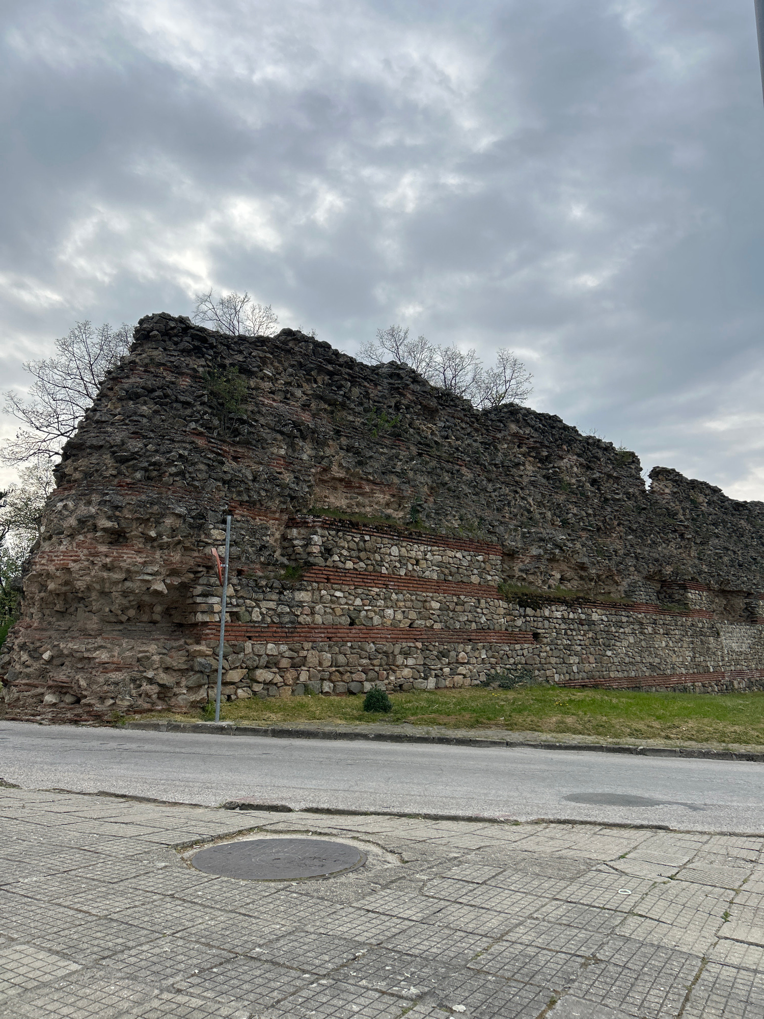 The image displays an ancient, robust stone wall under an overcast, cloudy sky. Located in Hisarya, Bulgaria, the wall is constructed from various sizes of irregular dark stones and mortar, featuring…read more