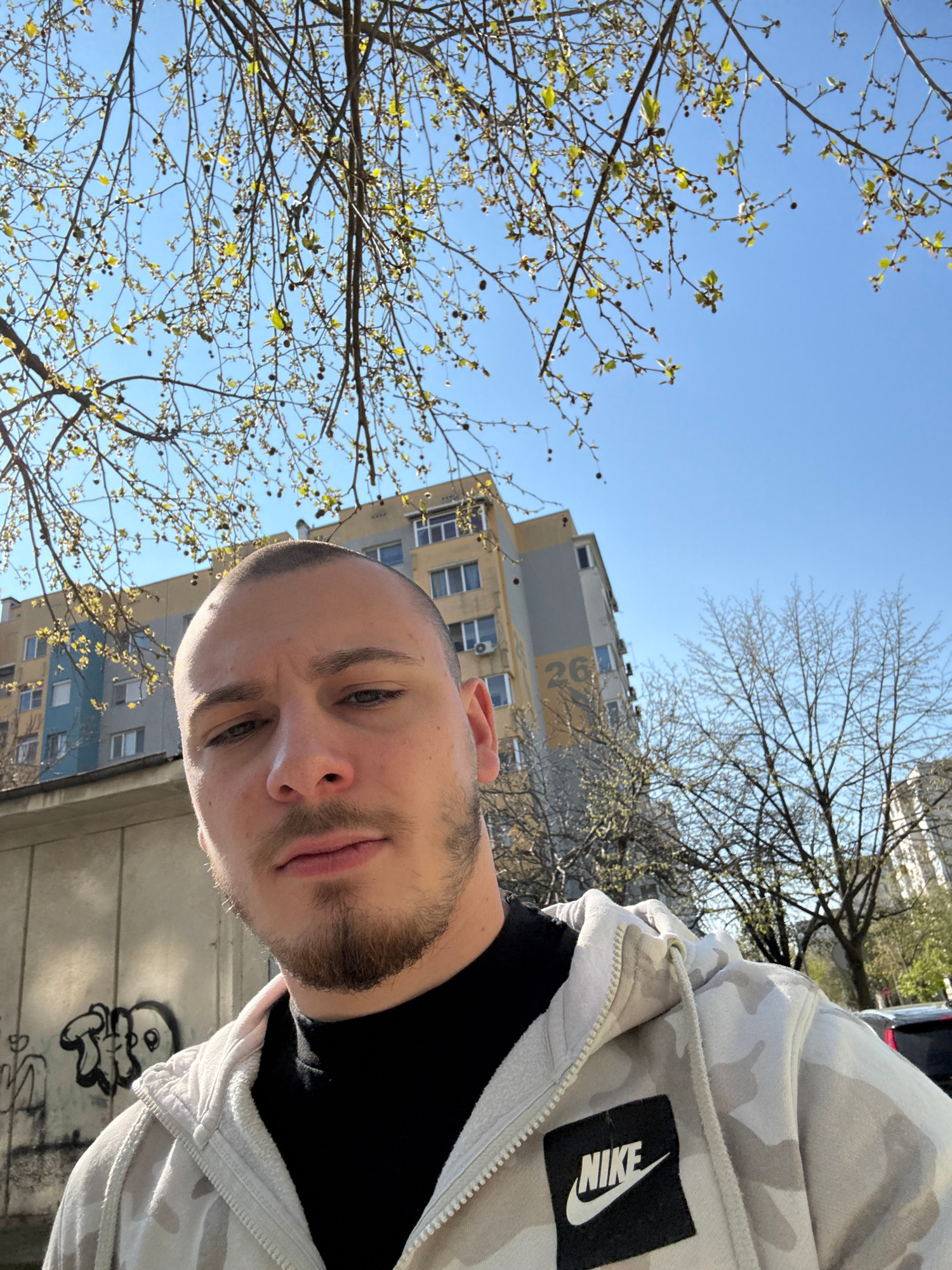 A medium shot of a Caucasian male in his late twenties taking a selfie outside. The sky is bright blue and there is a building visible in the background. The man is wearing a black shirt under a white…read more