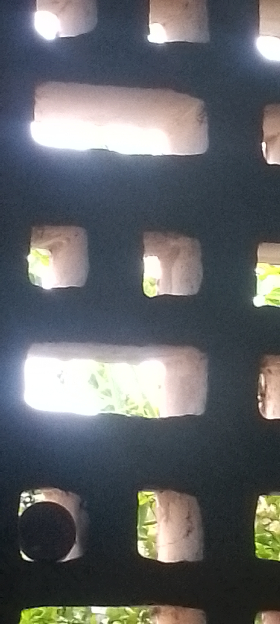 The image shows a section of a wall with rectangular and square openings, possibly made of bricks or similar material. Light shines through the openings, creating bright patches and revealing glimpses…read more