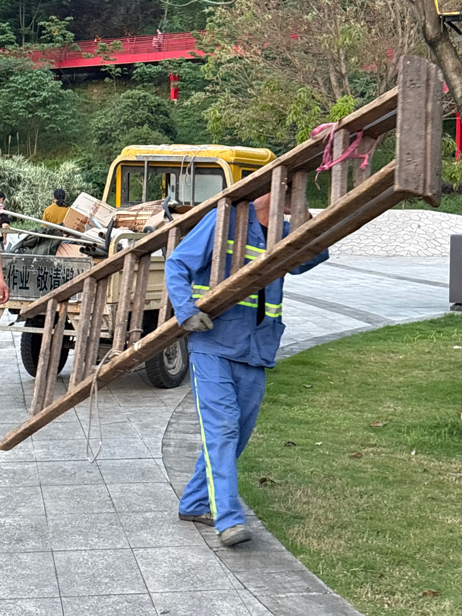 A person wearing a blue work uniform with reflective yellow-green stripes and gray gloves is carrying a wooden ladder, resting it on their shoulder. The ladder is tied with a pink ribbon at one point.…read more