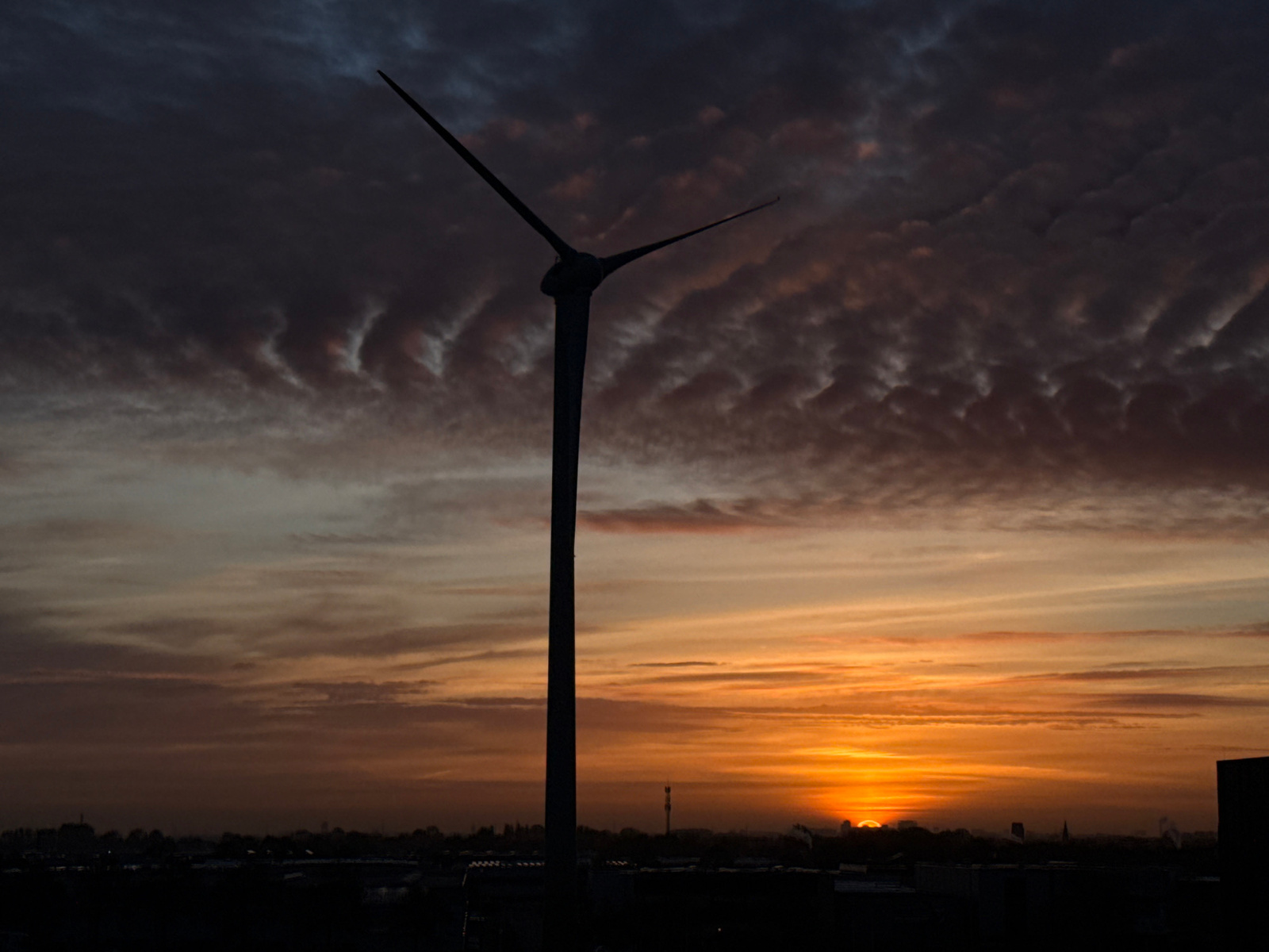 A prominent wind turbine stands in stark silhouette against a dramatic sunrise or sunset sky over Maasdijk, Netherlands. The central turbine, with its three distinct blades, dominates the frame, appea…read more