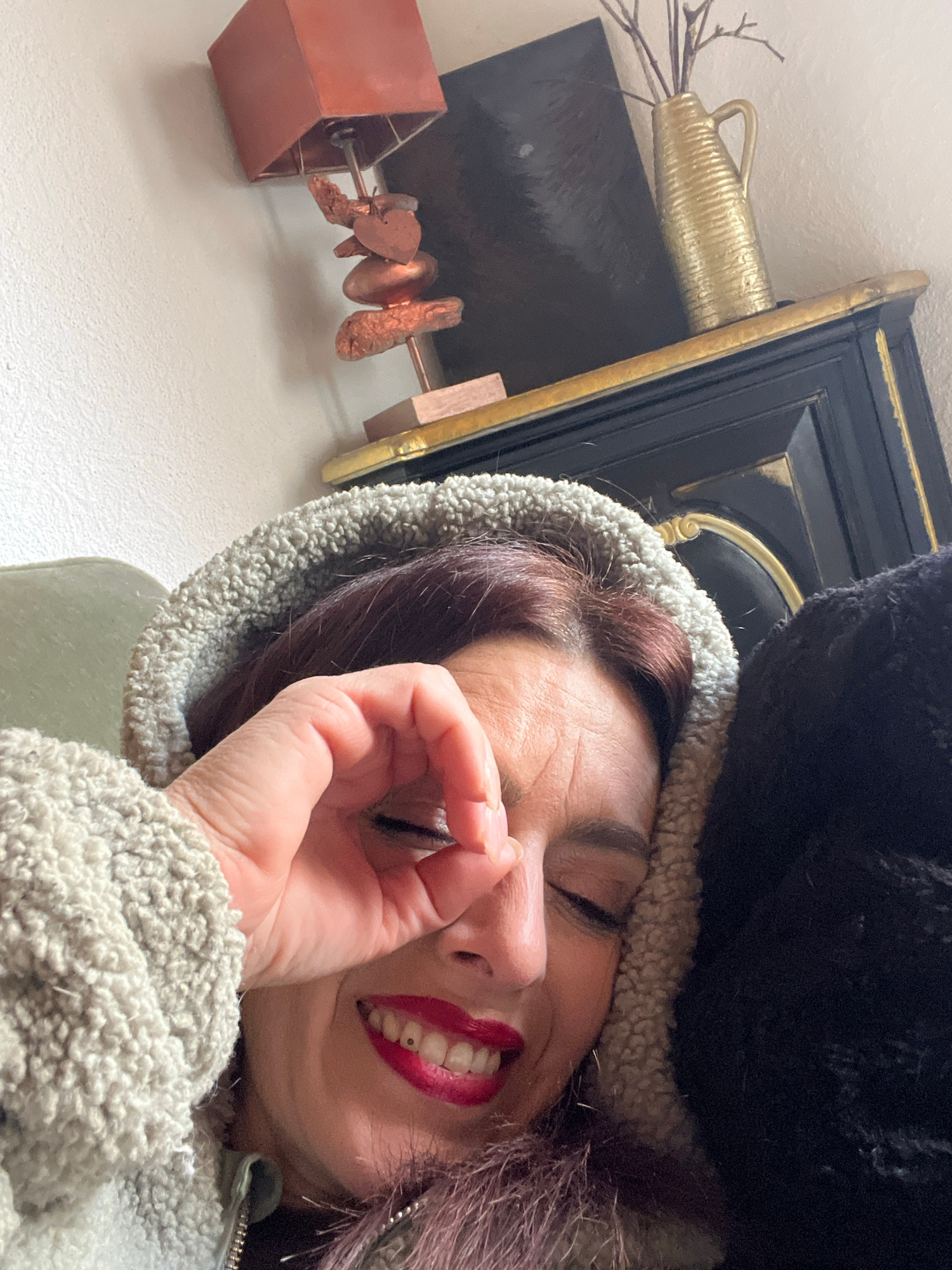 A close-up, tilted selfie shows a woman with auburn hair and red lipstick, wearing a fuzzy gray hooded jacket and a black hat. She has one eye closed and her hand partially covers her face in a gestur…read more