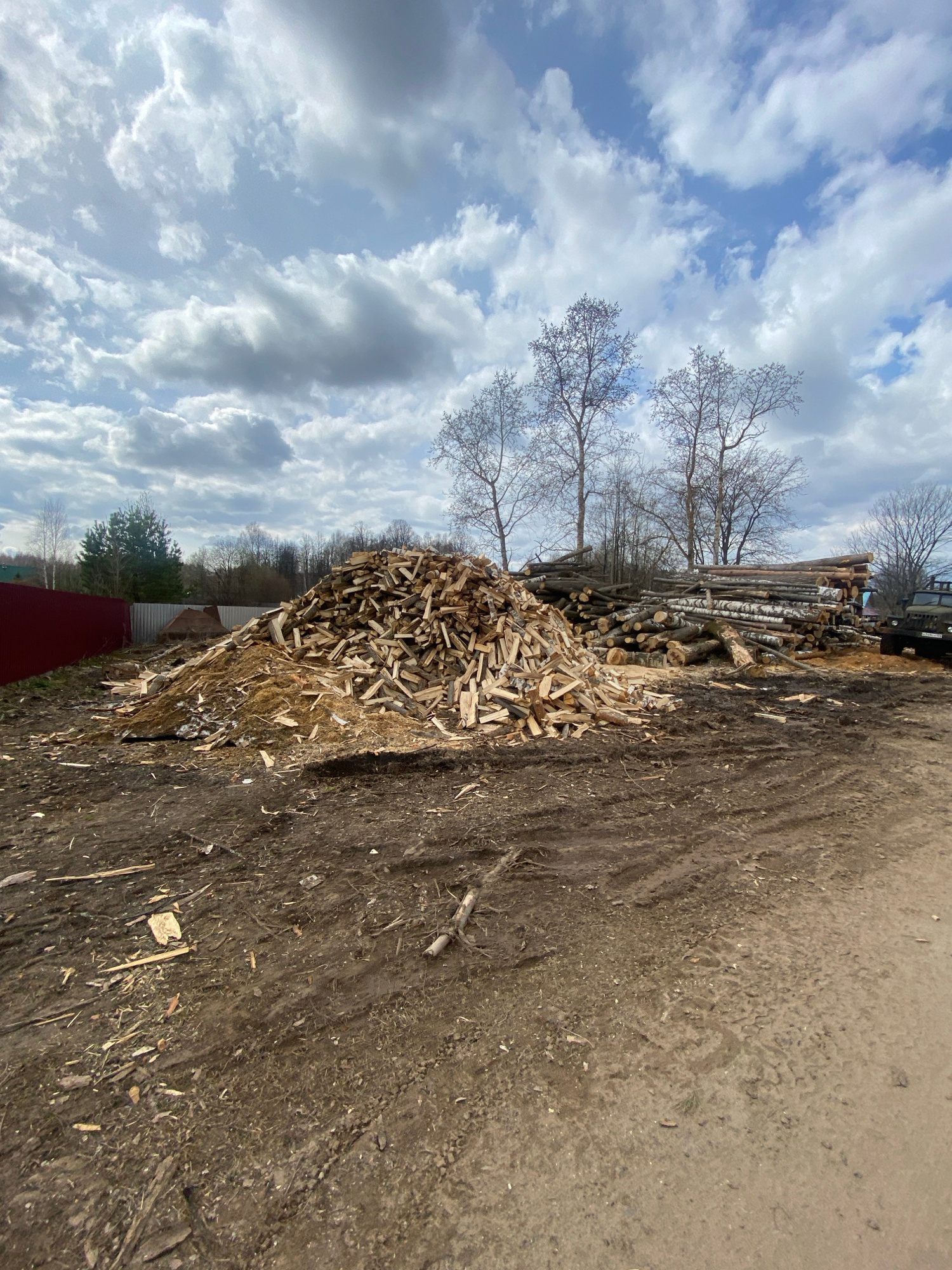 The image shows a pile of firewood and wood chips next to a dirt road in Zhigalki, Russia. Behind the wood pile is a stack of logs and trees. In the background, there are trees and a cloudy sky. Part…read more