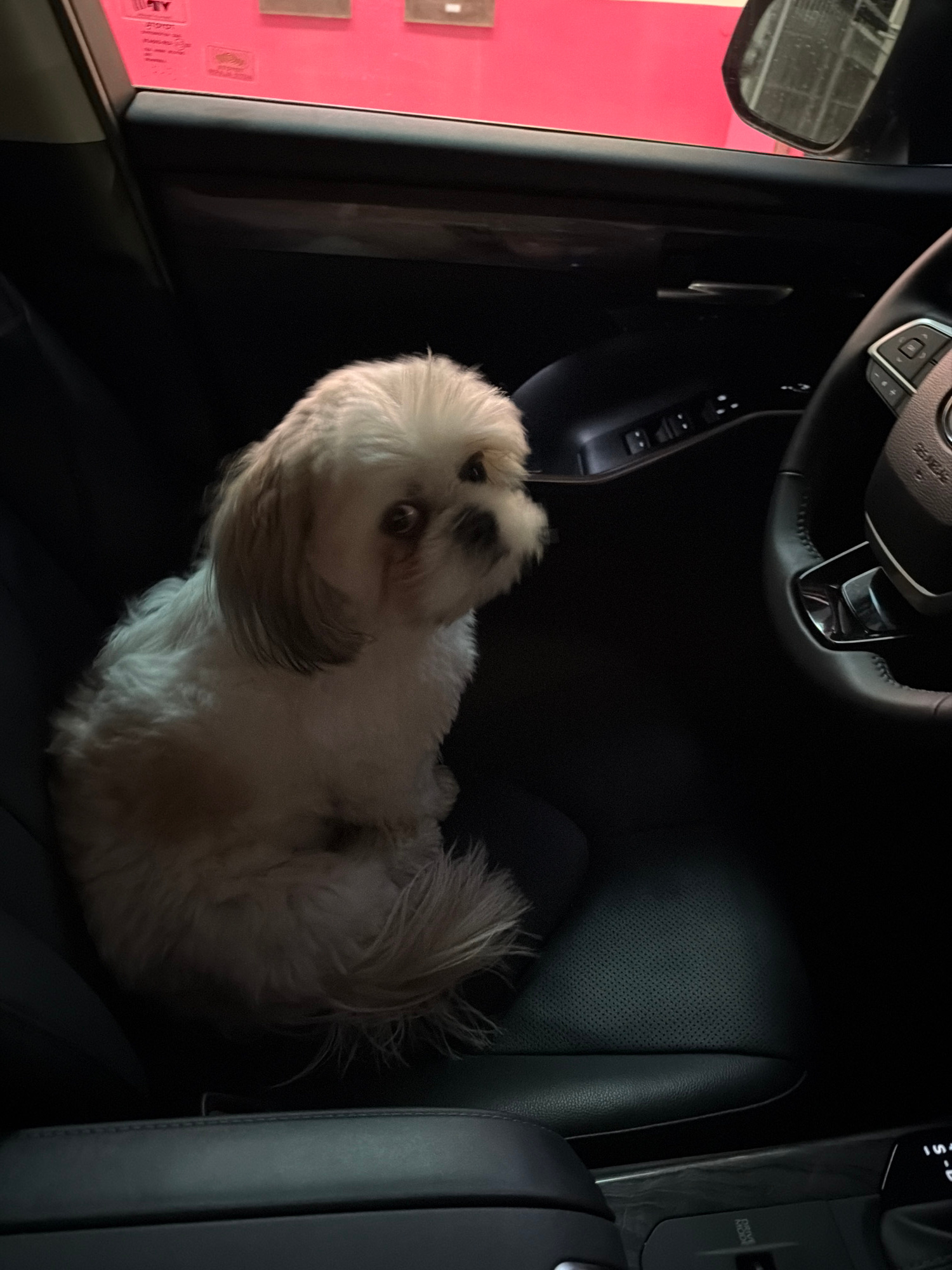 A Shih Tzu sits in the passenger seat of a car. The car is likely at a drive-through establishment, given the pink structure visible through the car window. The car's interior features a black leather…read more