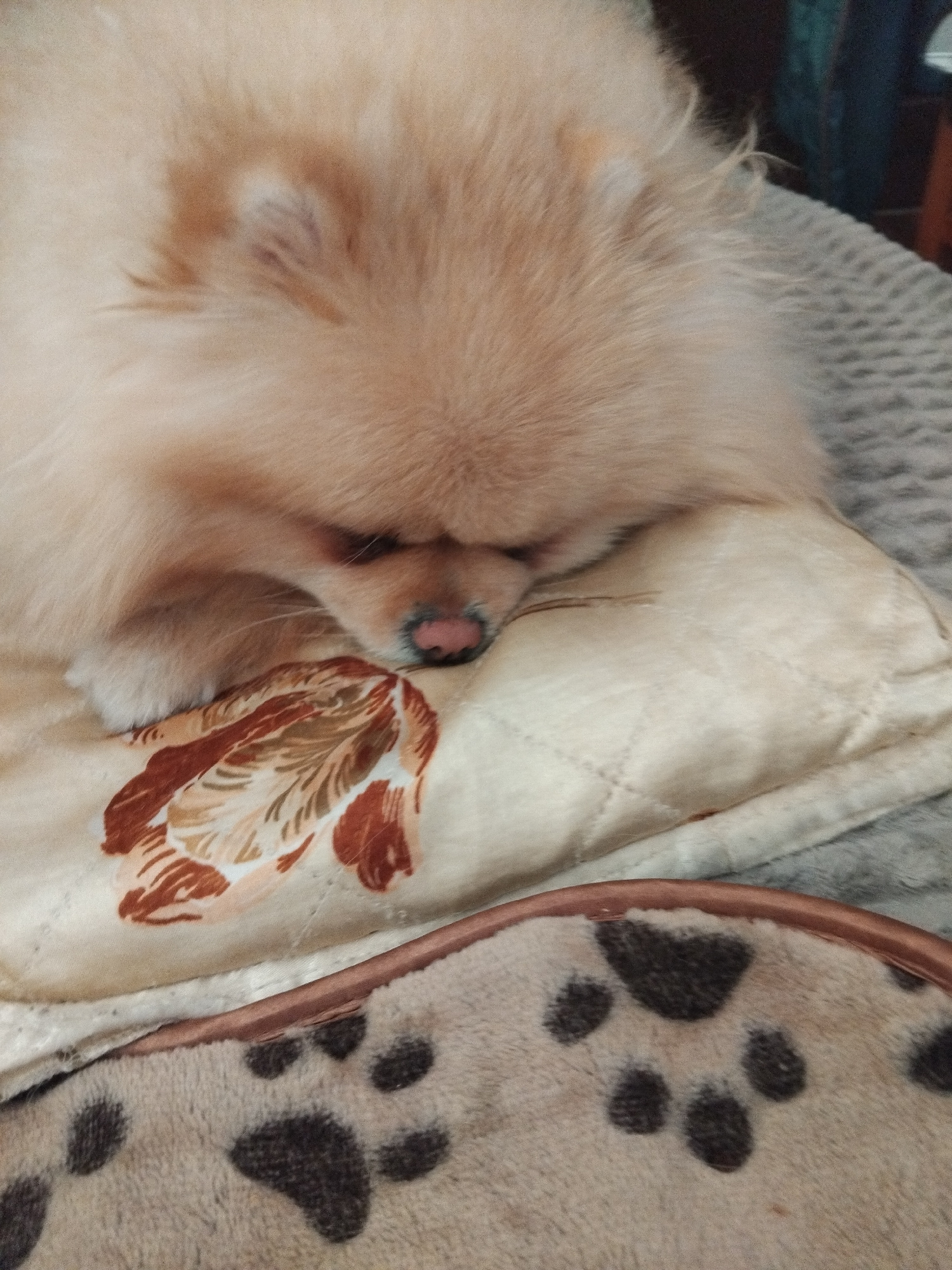 A Pomeranian dog is lying curled up on a quilted off-white cushion with a floral pattern, placed within a tan pet bed decorated with black paw prints. The scene is likely indoors, in Apriltsi, Bulgari…read more