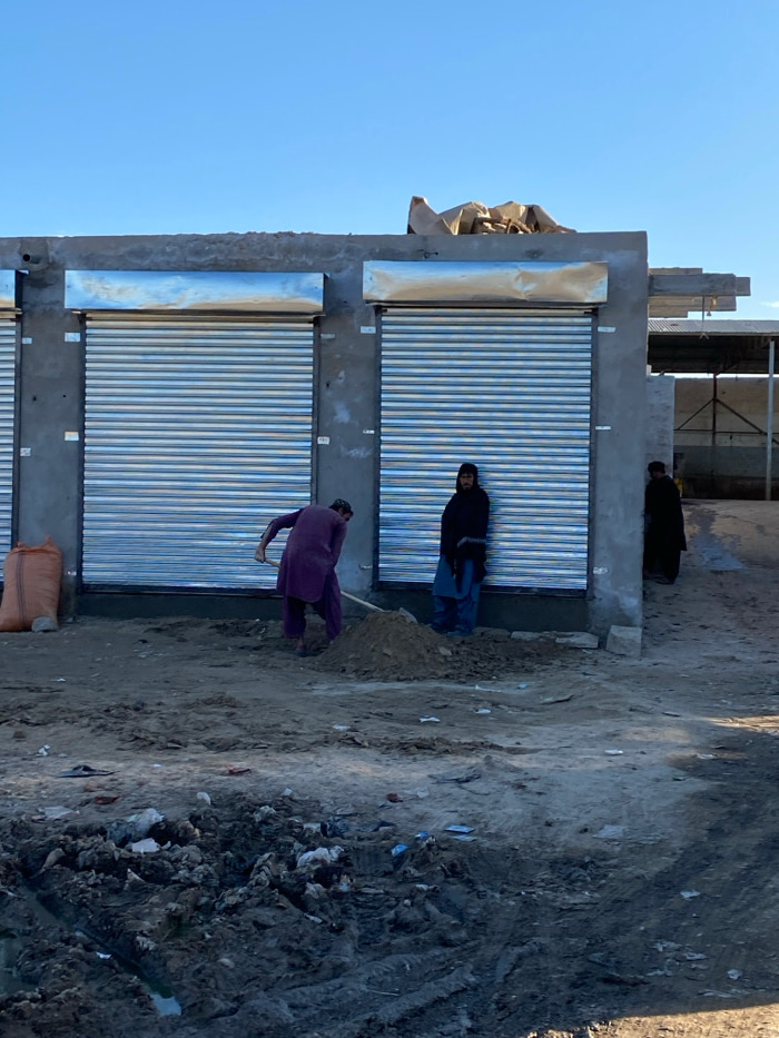 The image depicts an outdoor scene in Jabadar, Afghanistan, under a clear blue sky. In the foreground, the ground is composed of uneven, light brown dirt with darker, muddier patches and visible tire…read more