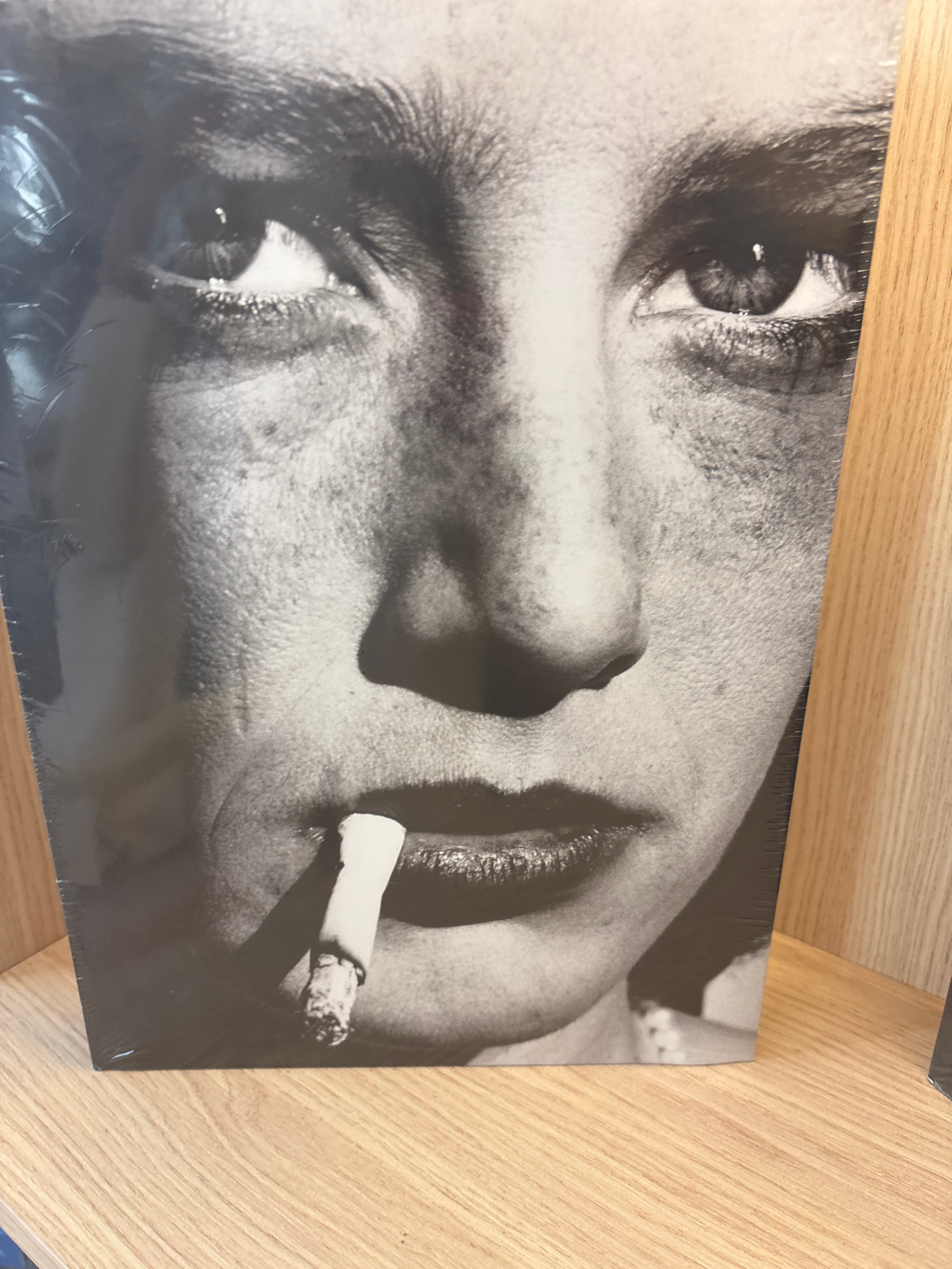 The image is a close-up, black and white photograph of a person's face. The person is holding a lit cigarette in their mouth. The focus is on the person's eye, nose, and lips. The image cannot be use…read more