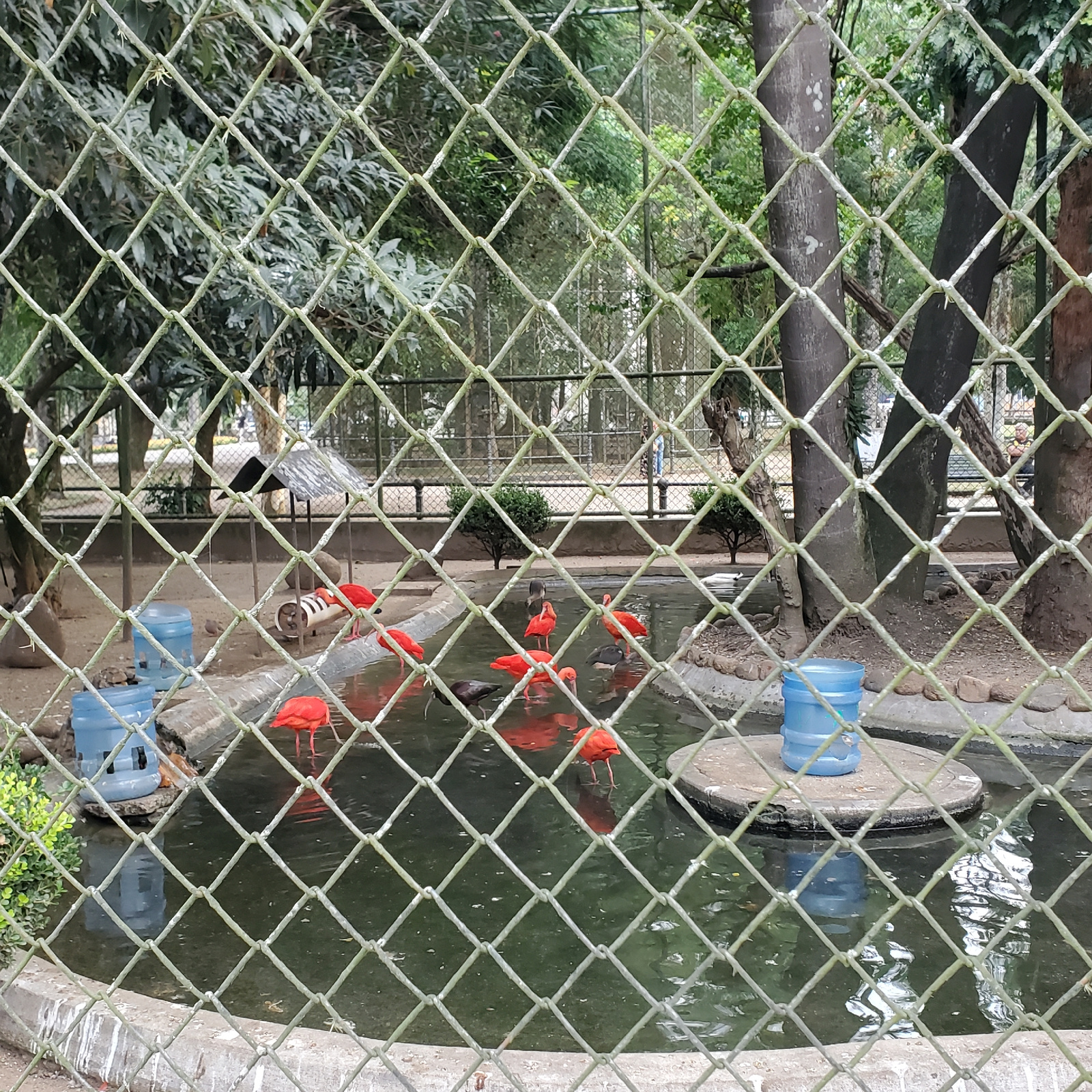 This vertical photograph captures a vibrant scene inside a bird enclosure, viewed through a chain-link fence. The fence, with its diamond-shaped mesh, dominates the foreground, creating a slightly blu…read more
