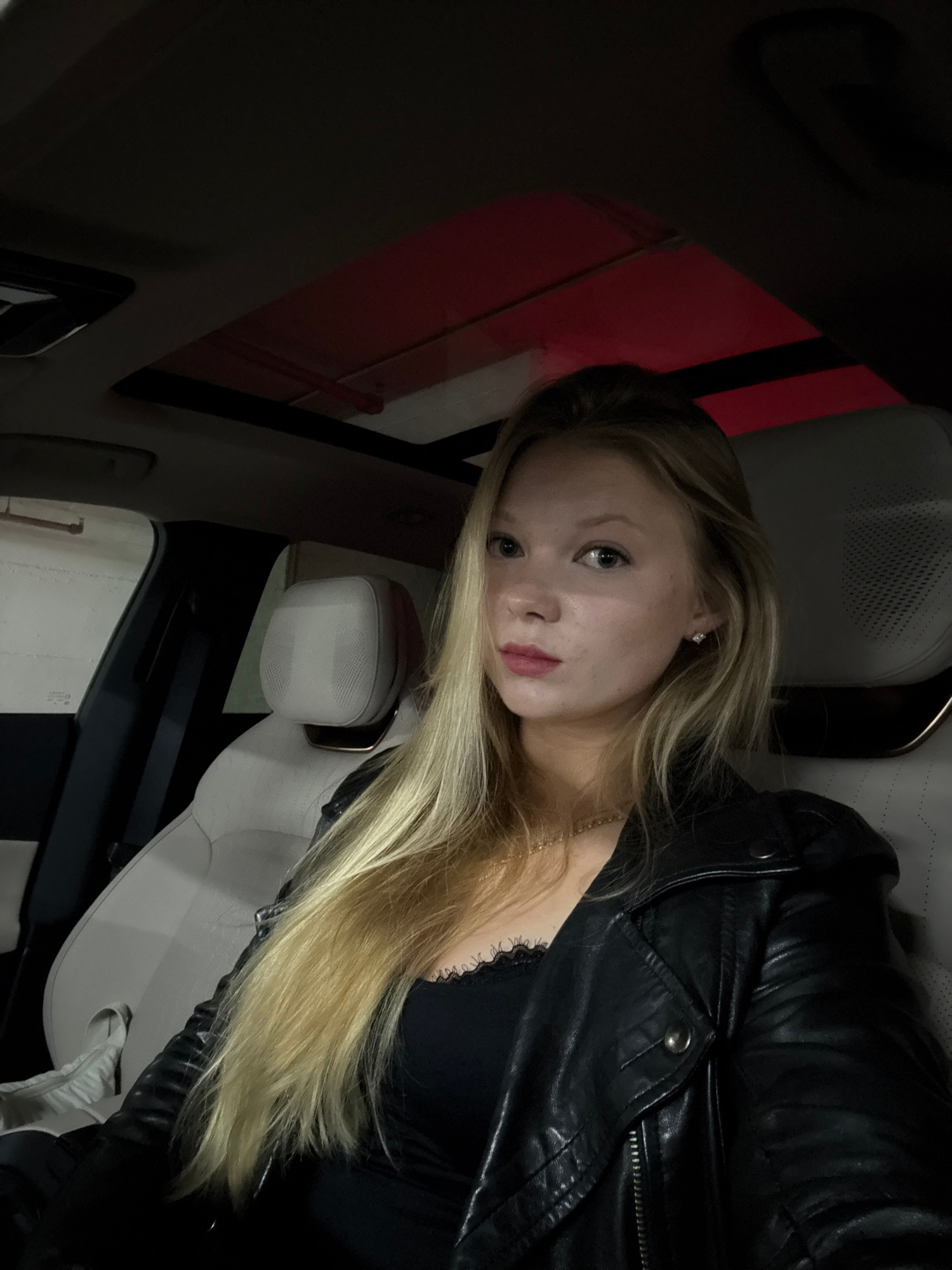 A young woman with blonde hair is reclining in the passenger seat of a car. She is wearing a black leather jacket and a black top. The interior of the car is light-colored with a sunroof visible. Theβ¦read more