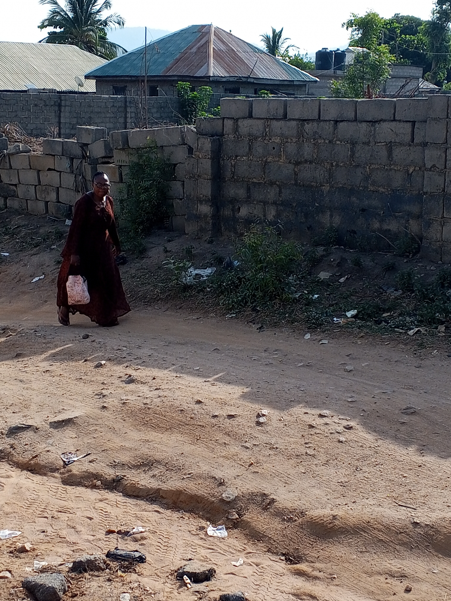 The image captures a woman walking on a dry, unpaved dirt path in a residential area of Adonkolo, Nigeria, under bright daylight. The woman, of middle to older age, wears glasses and a loose, full-len…read more